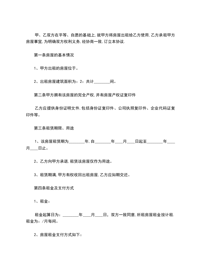 1、本合同租赁期限共__个月,自__起至__止。房屋为现状交付,乙方承租该房屋仅作为__使用,未经甲方同意,不能挪作他用。