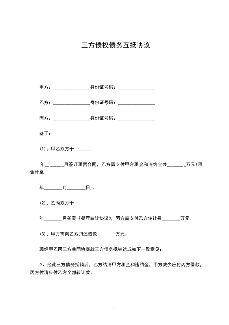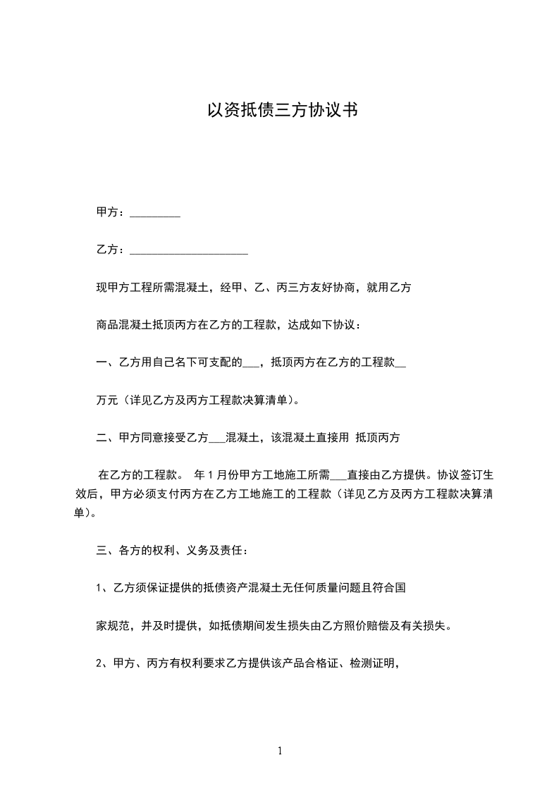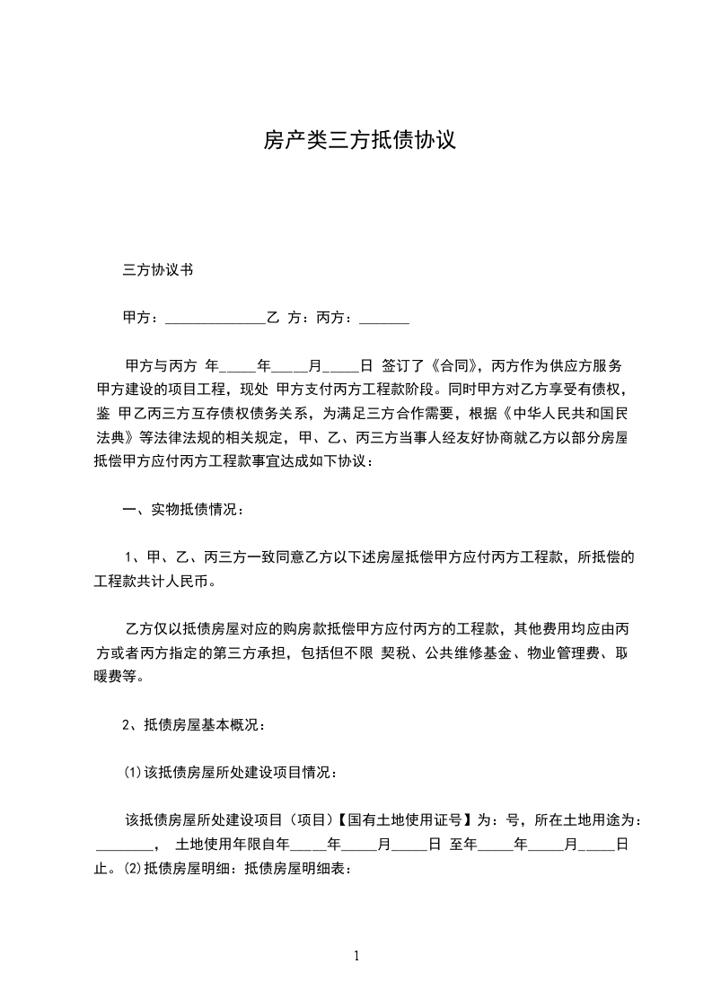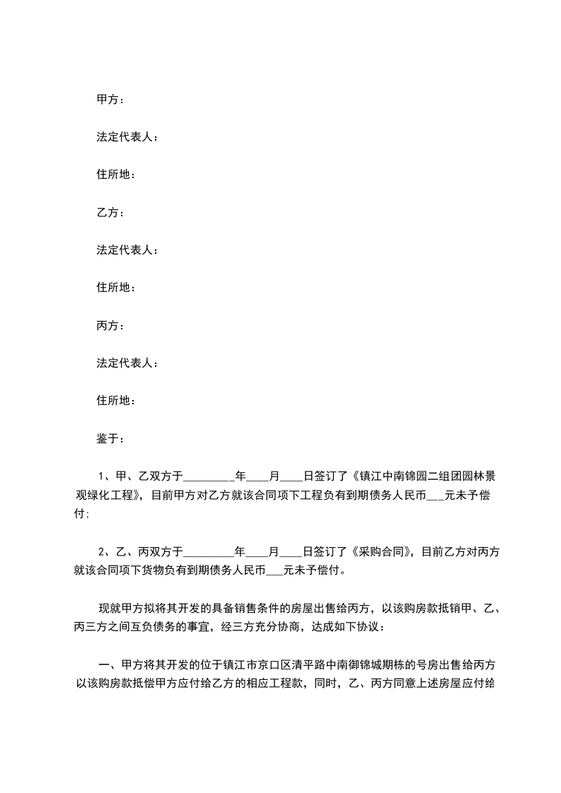 三、甲乙丙三方同意按上述房屋的作价冲抵相应欠款,即冲抵甲方对乙方的工程欠款人民币___元,冲抵乙方对丙方的货物欠款人民币___元。