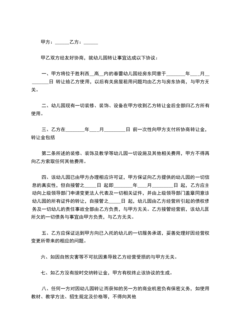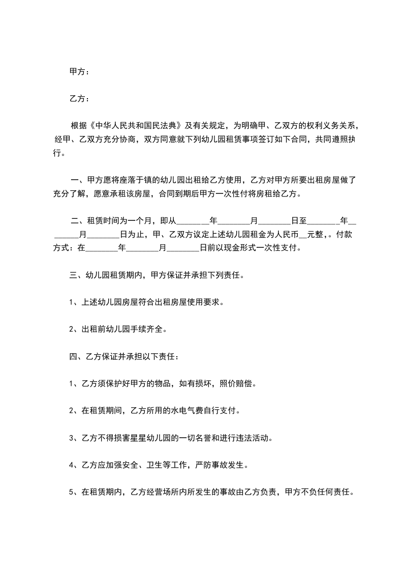 二、租赁时间为一个月,即从________年________月________日至________年________月________日为止,甲、乙双方议定上述幼儿园租金为人民币__元整,。付款方式:在________年________月________日前以现金形式一次性支付。