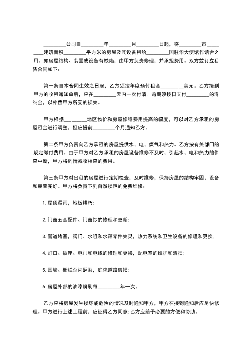 _________公司自_________年_________月_________日起,将_________市_________建筑面积_________平方米的房屋及其设备租给_________国驻华大使馆作馆舍之用。如房屋结构、装置或设备有缺陷,由甲方负责修理,并承担费用。双方兹订立租赁合同如下: