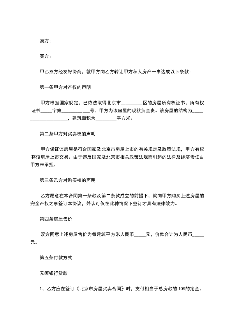 1、乙方应在签订《北京市房屋买卖合同》时,支付相当于总房款的10%的定金。