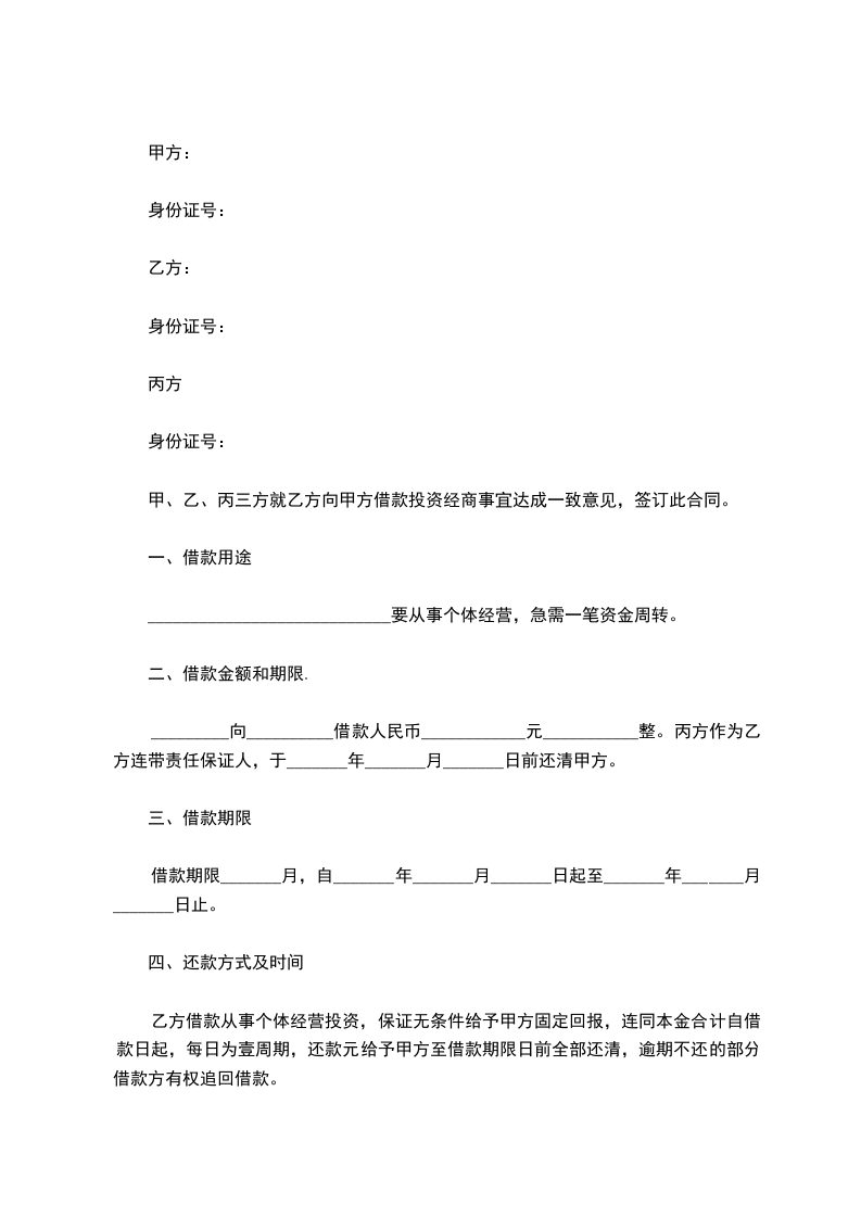 乙方借款从事个体经营投资,保证无条件给予甲方固定回报,连同本金合计自借款日起,每日为壹周期,还款元给予甲方至借款期限日前全部还清,逾期不还的部分借款方有权追回借款。