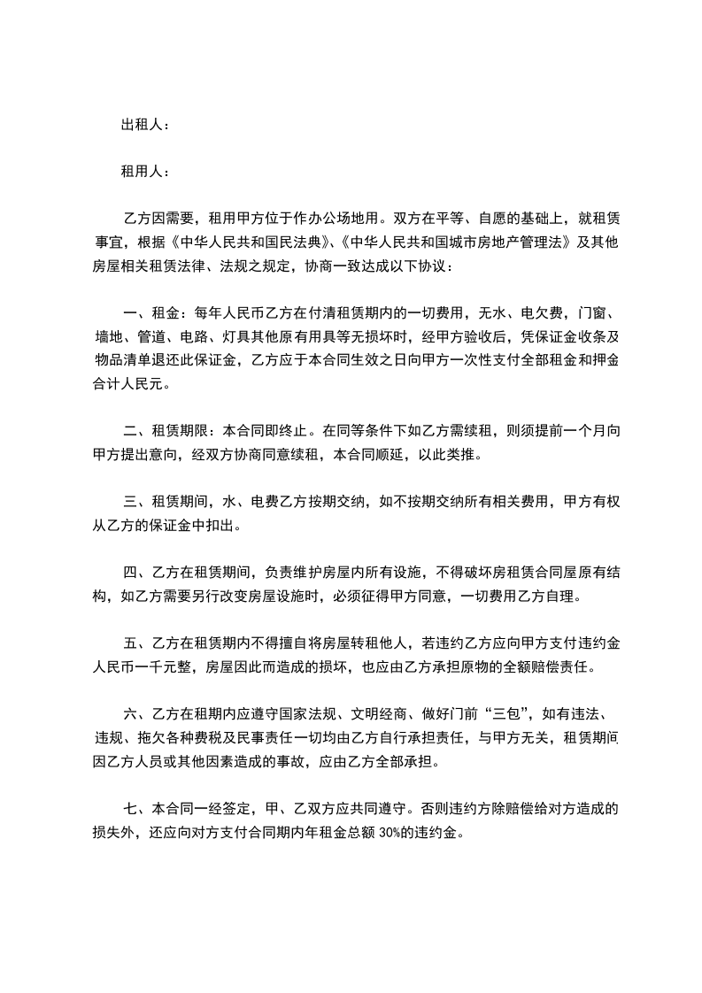 2.甲方出租给乙方的房屋租赁期共_个月。自_年__月__日起至_年__月__日止。乙方向甲方承诺,租赁该房屋仅作为使用。租赁期满,甲方有权收回出租房屋,乙方应如期交还。乙方如要求续租,则必须在租赁期满个月之前书面通知甲方,经甲方同意后,重新签订租赁合同。