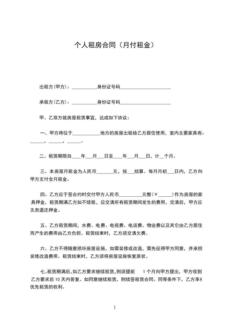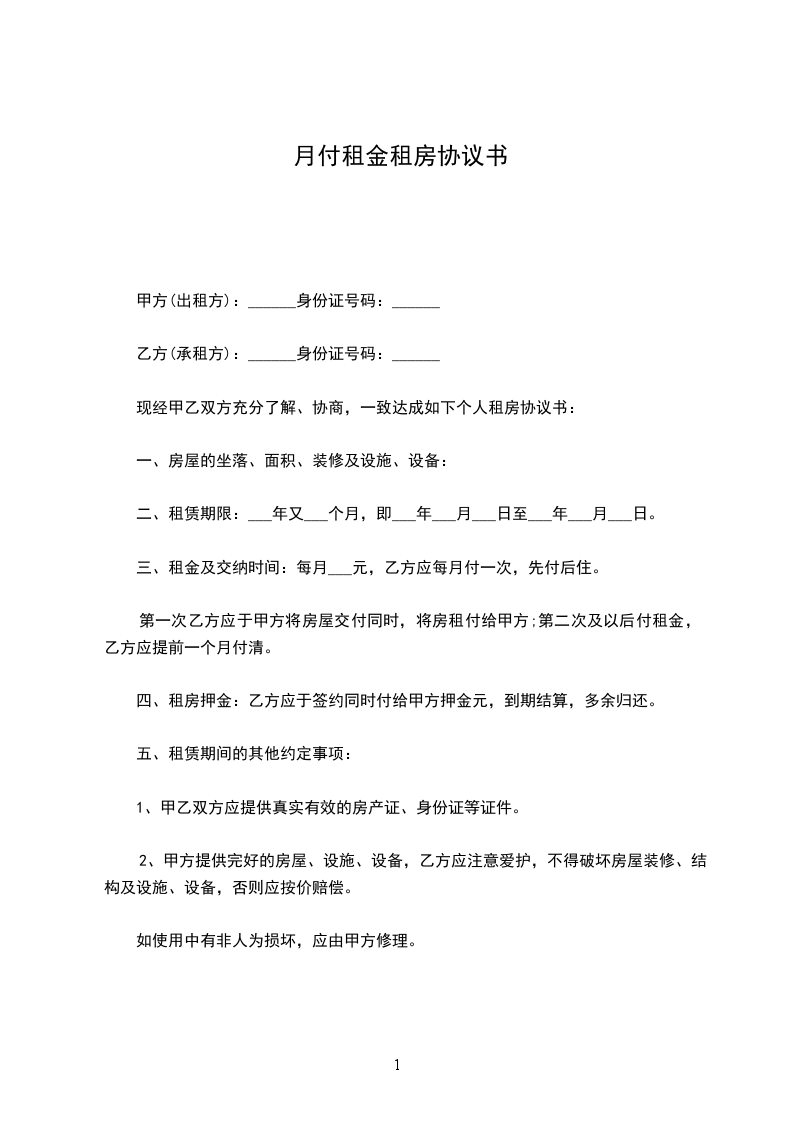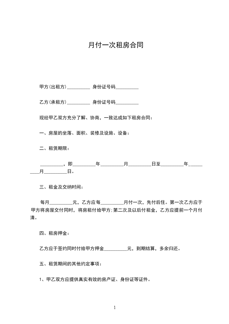 三、付款方式:一月一付,先付后住。