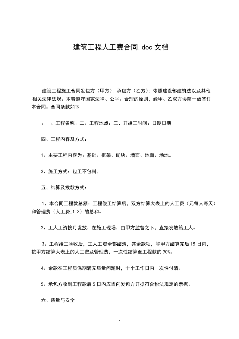 六、人工费的支付:工成完工后乙方凭税票,甲方一次性付款。