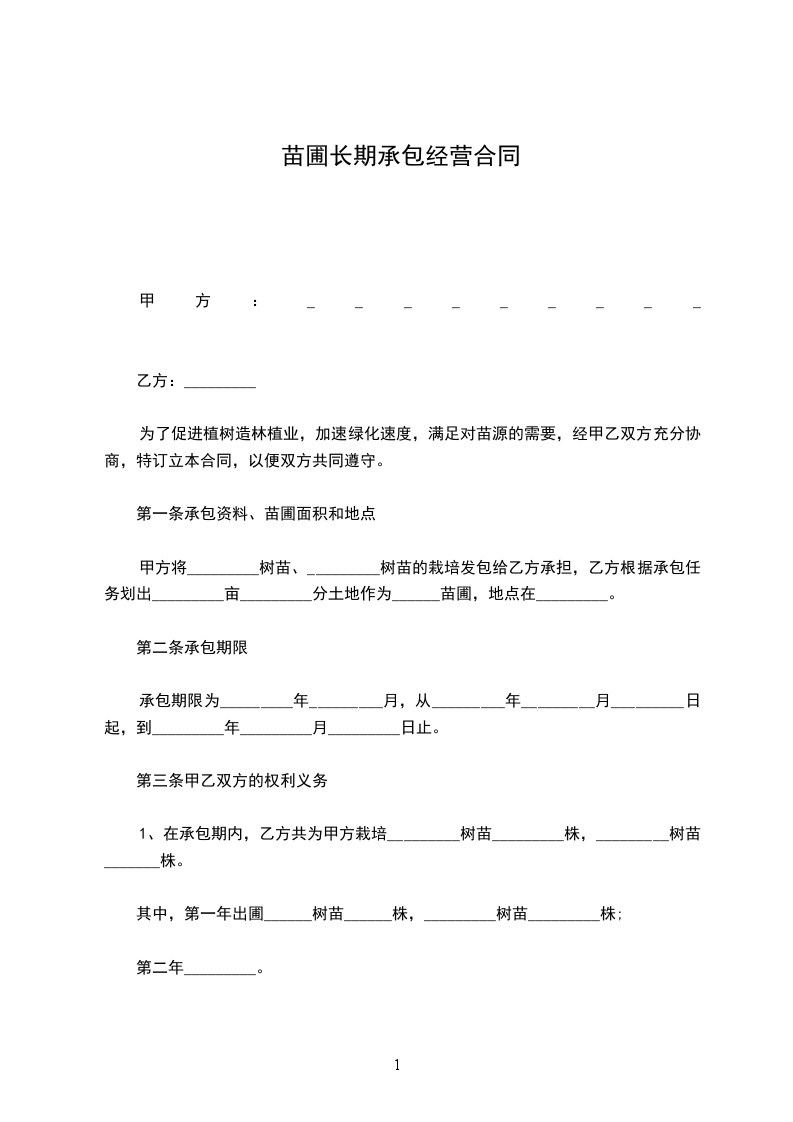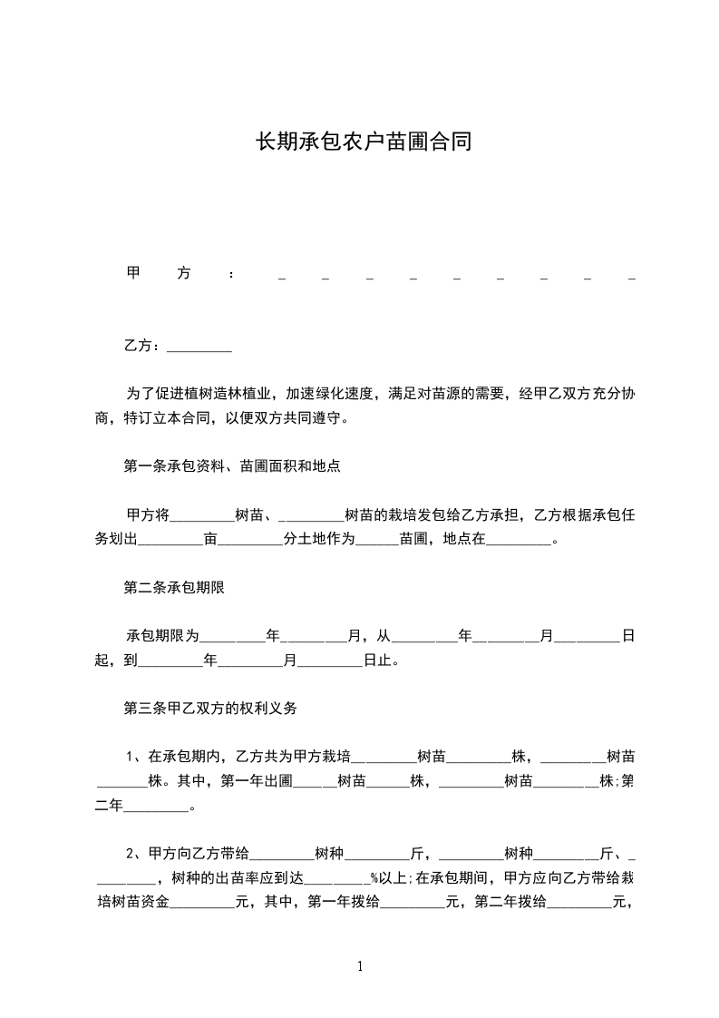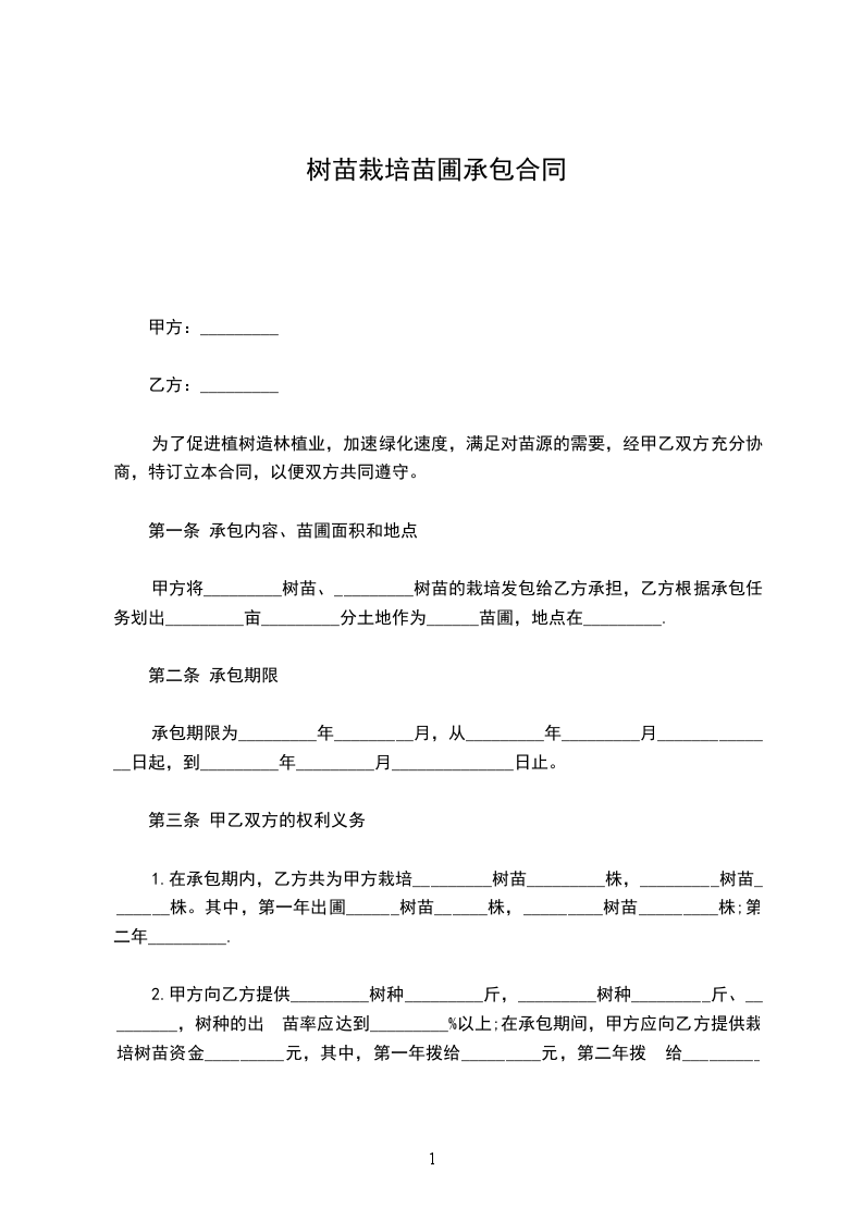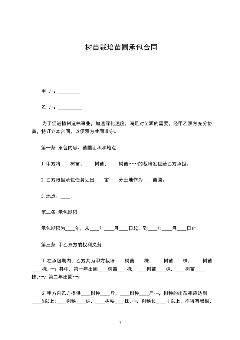 为了促进植树造林植业,加速绿化速度,满足对苗源的需要,经甲乙双方充分协商,特订立本合同,以便双方共同遵守。