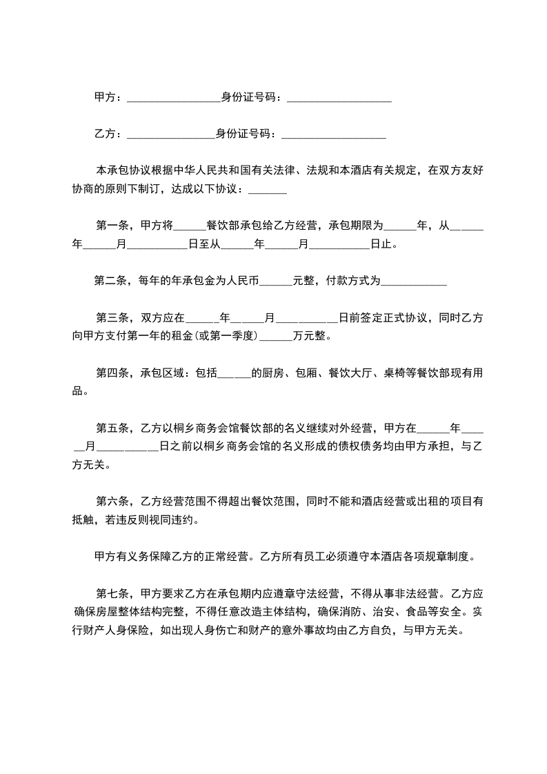 第一条为加强餐饮经营管理工作,不断提高经济效益和社会效益。根据国家有关法律、法规、省市有关政策以及股东会有关文件精神,结合企业实际状况,本着实事求是、真诚合作、互惠互利的原则,全体股东共同签订餐饮承包经营合同书以下简称合同,由甲方、乙方整体承包经营以下简称承包经营方。