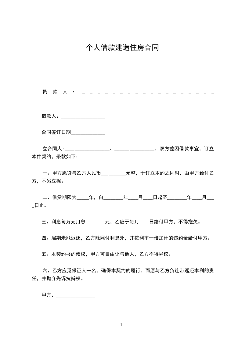 一、甲方愿贷与乙方人民币__________元整,于订立本约之同时,由甲方给付乙方,不另立据。
