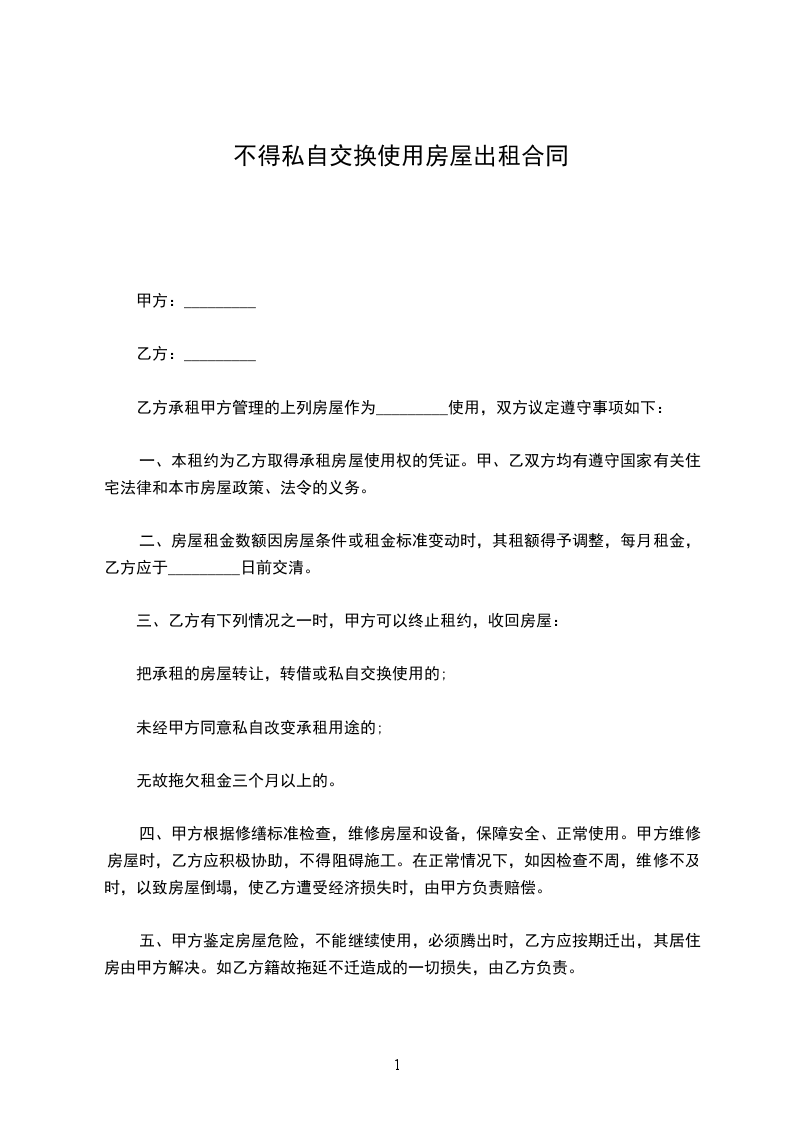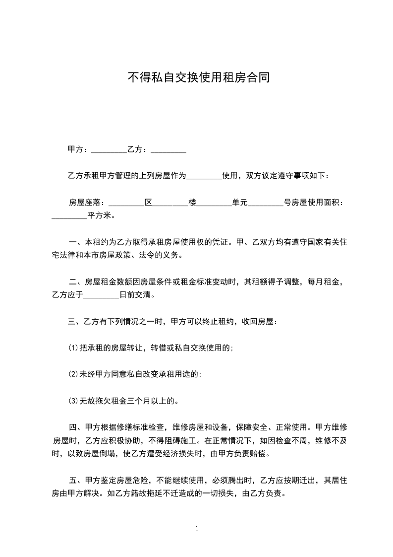 4、房屋只限乙方使用,乙方不得私自转租、改变使用性质或供非法用途。租下本房后,乙方应立即办好租赁登记、暂住人口登记等手续。若发生非法事件,乙方自负后果。在租赁期限内,甲方确需提前收回房屋时,应当事先商得乙方同意,给乙方造成损失的,应当予以赔偿。
