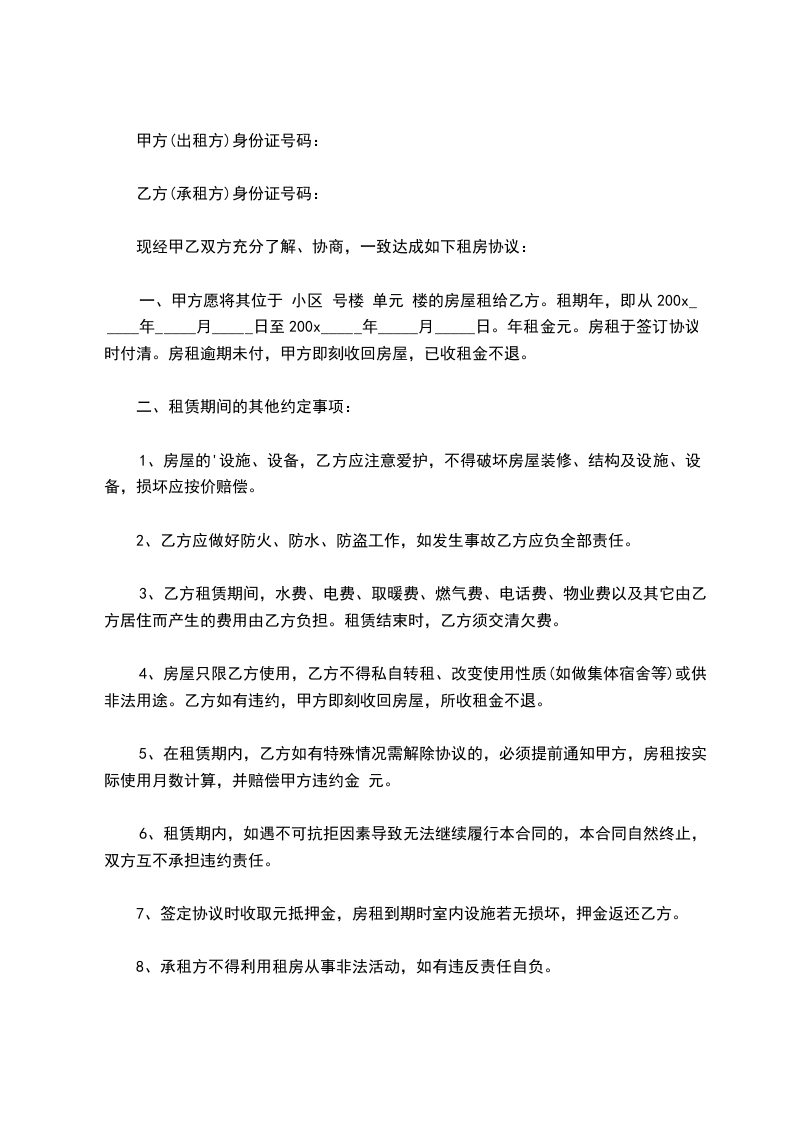 现经甲乙双方充分了解、协商,一致达成如下租房合同: