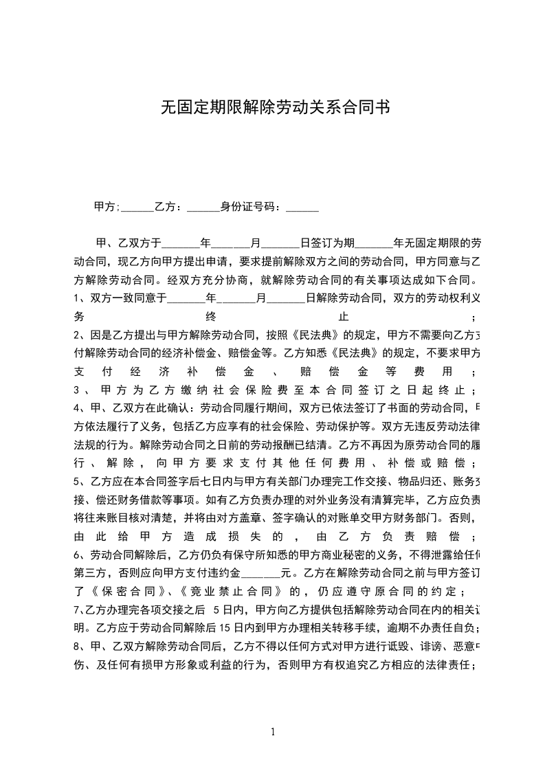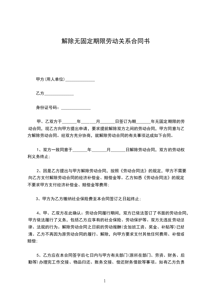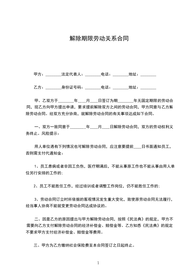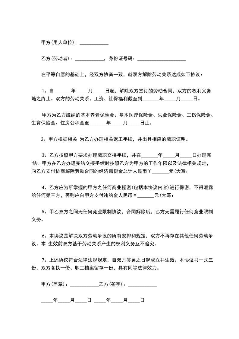 1、自______年____月____日起,解除双方签订的劳动合同,双方的权利义务随之终止。
