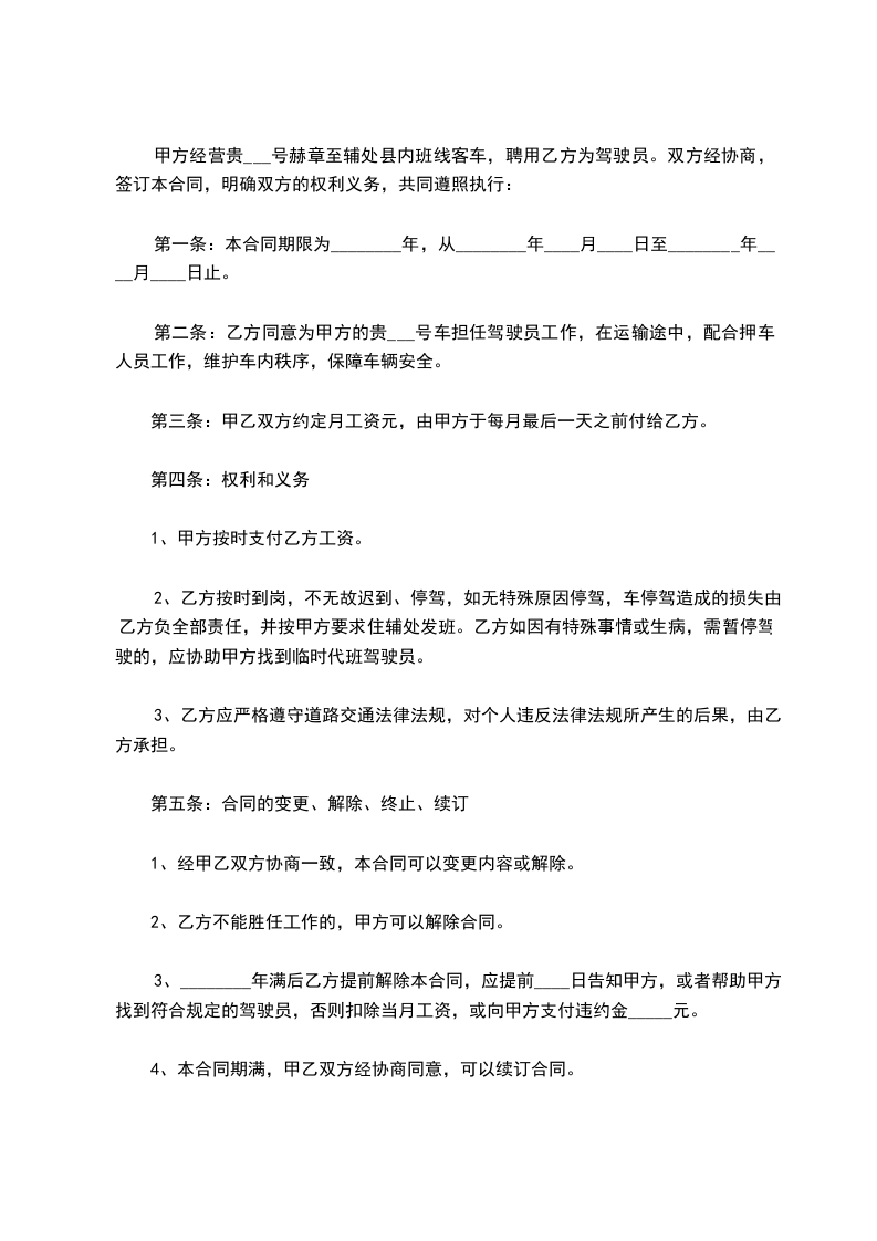 甲方经营贵___号赫章至辅处县内班线客车,聘用乙方为驾驶员。双方经协商,签订本合同,明确双方的权利义务,共同遵照执行: