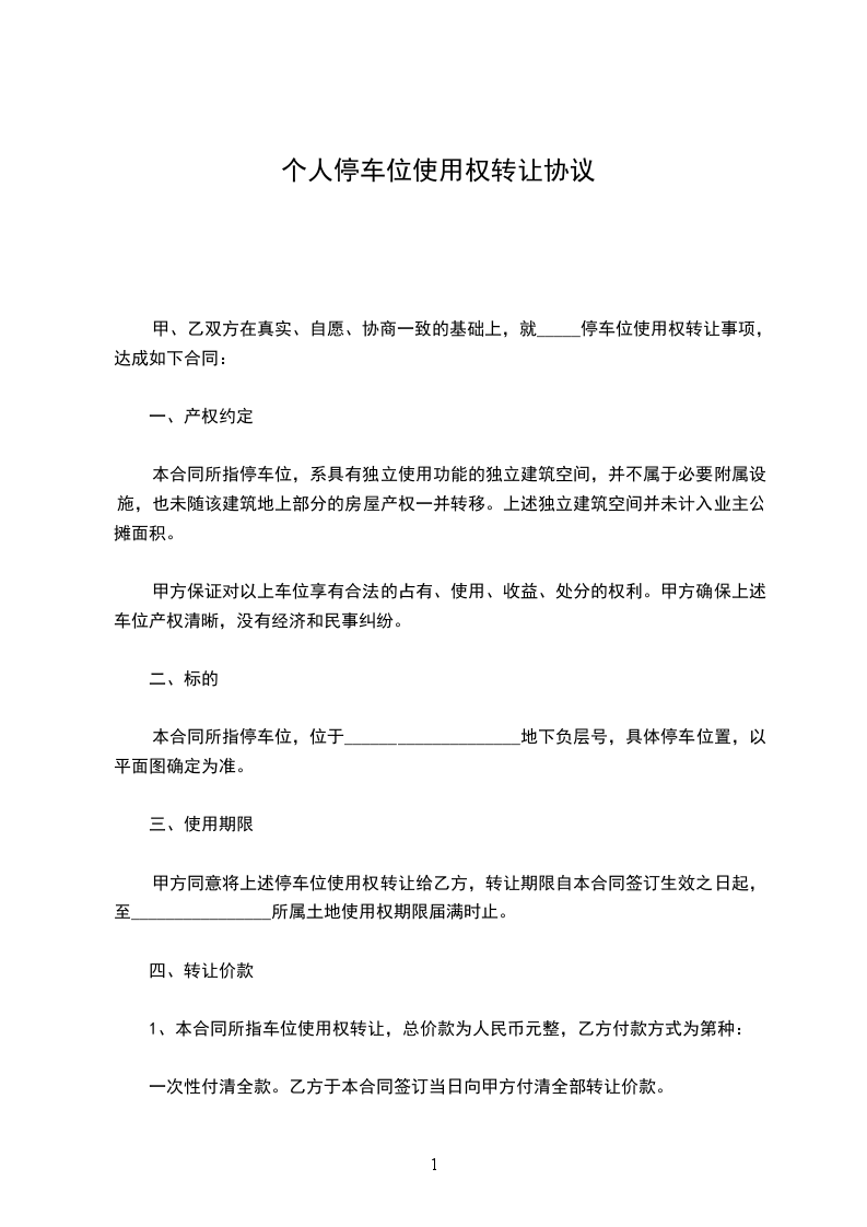 甲、乙双方在真实、自愿、协商一致的基础上,就_____停车位使用权转让事项,达成如下合同: