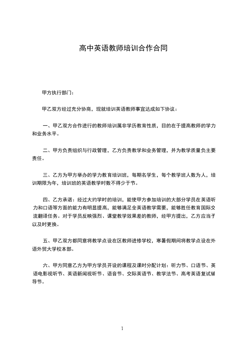 甲乙双方经过充分协商,现就培训英语教师事宜达成如下协议: