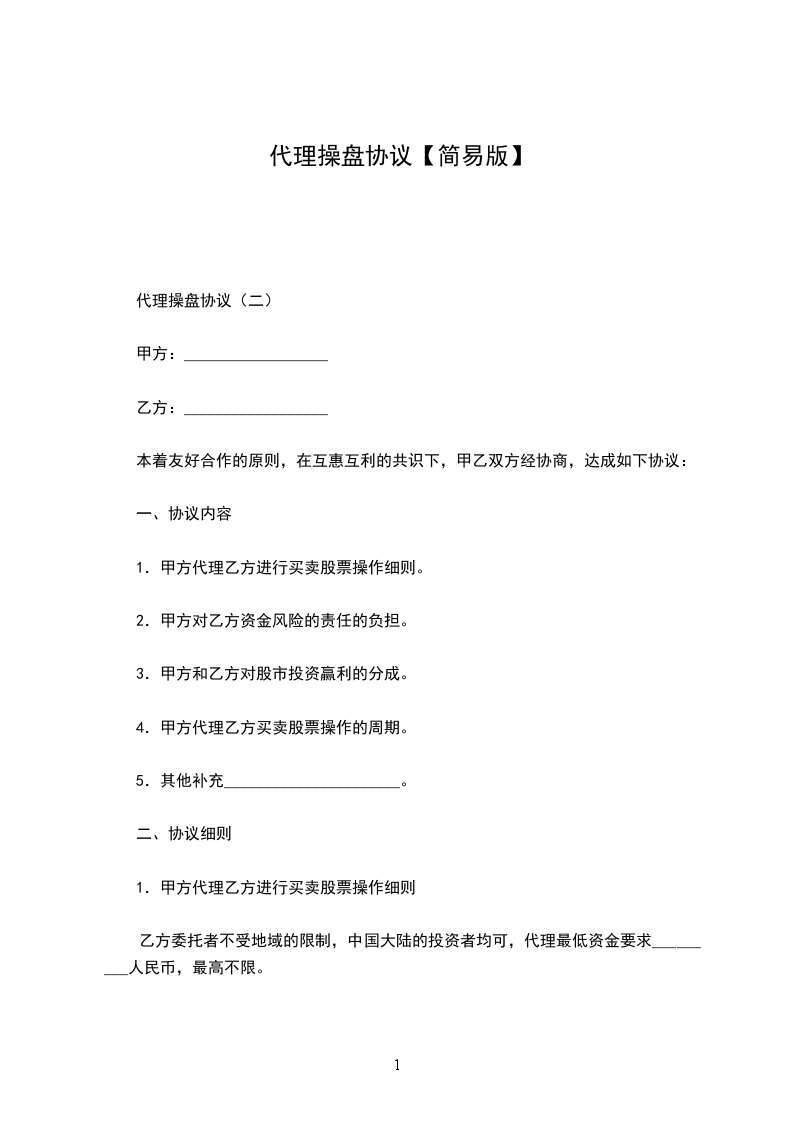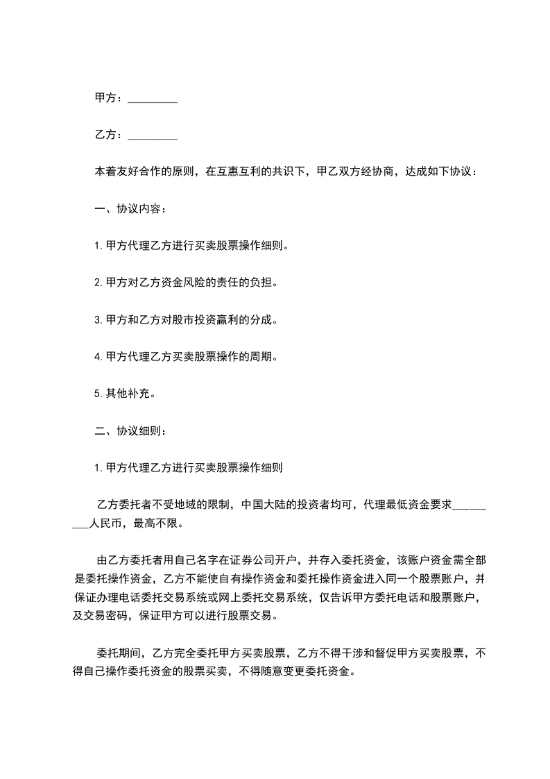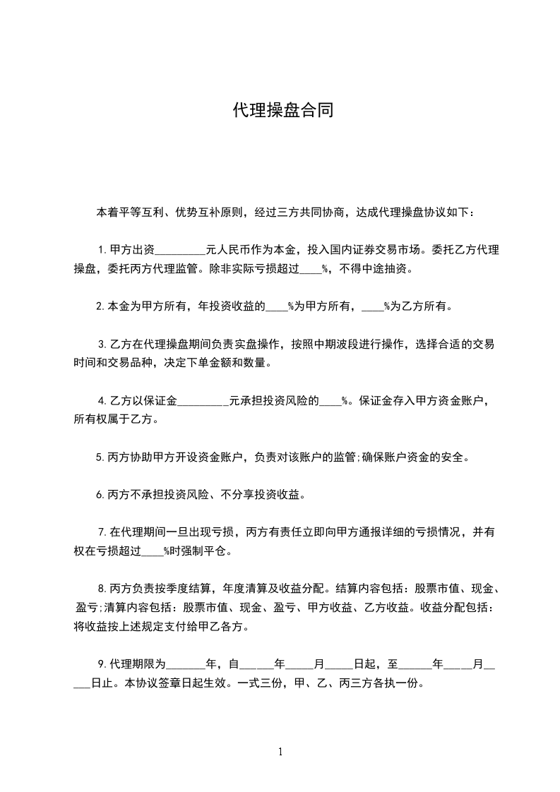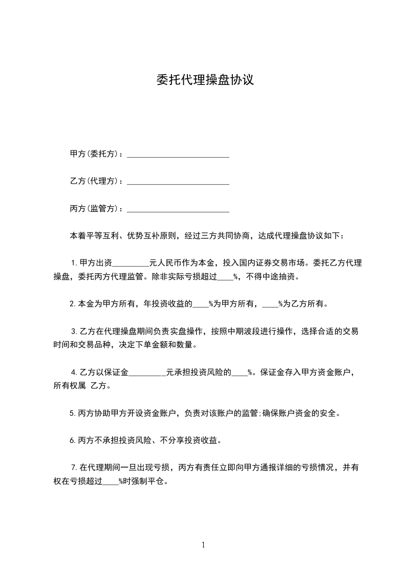 1.甲方出资_________元人民币作为本金,投入国内证券交易市场。委托乙方代理操盘,委托丙方代理监管。除非实际亏损超过____%,不得中途抽资。