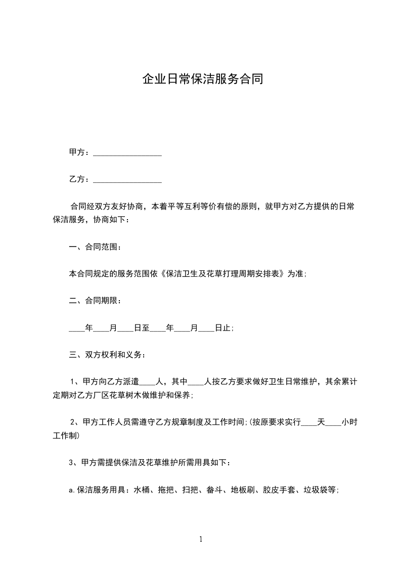合同经双方友好协商,本着平等互利等价有偿的原则,就甲方对乙方提供的日常保洁服务,协商如下: