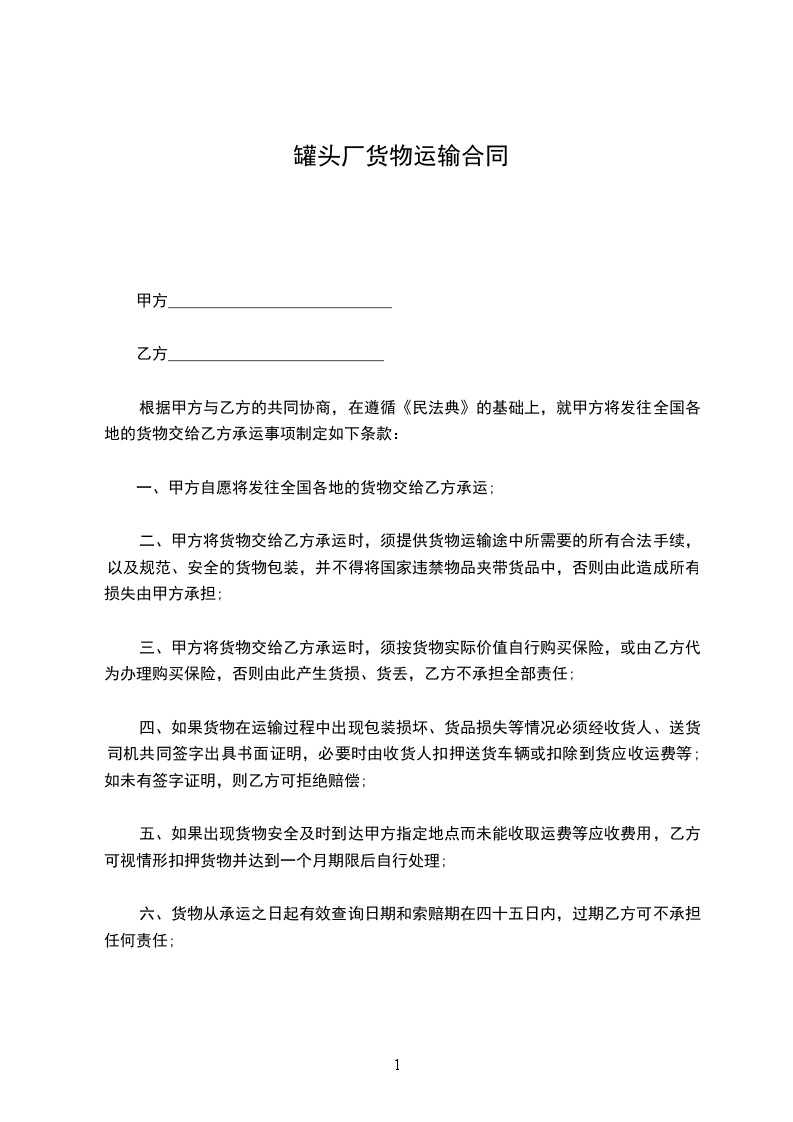 根据甲方与乙方的共同协商,在遵循《民法典》的基础上,就甲方将发往全国各地的货物交给乙方承运事项制定如下条款: