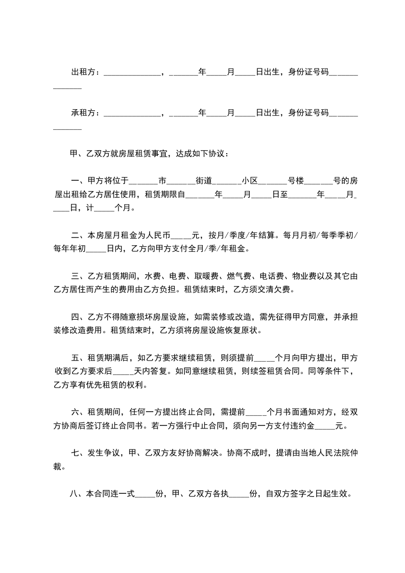 一、甲方将位于_______市_______街道_______小区_______号楼_______号的房屋出租给乙方居住使用,租赁期限自_______年_____月_____日至_______年_____月_____日,计_____个月。