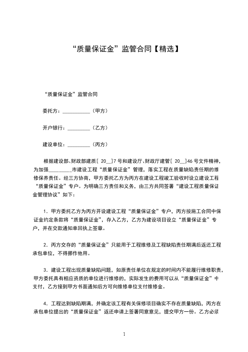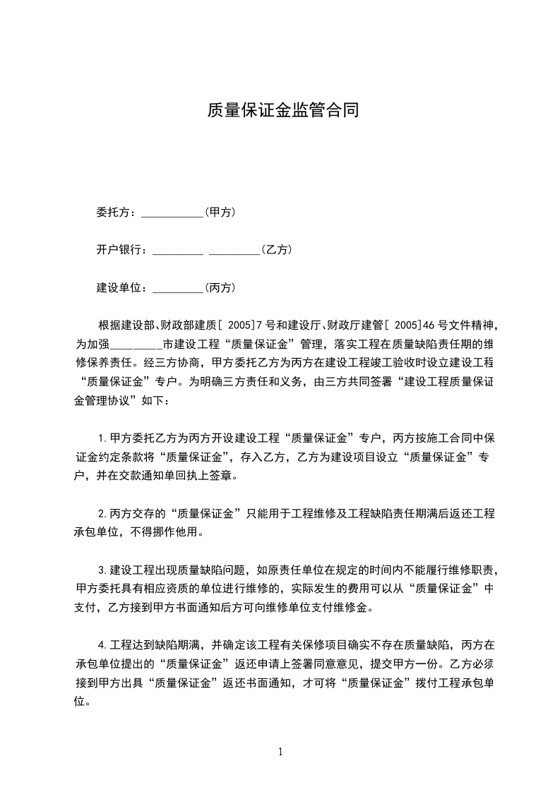 1.甲方委托乙方为丙方开设建设工程“质量保证金”专户,丙方按施工合同中保证金约定条款将“质量保证金”,存入乙方,乙方为建设项目设立“质量保证金”专户,并在交款通知单回执上签章。