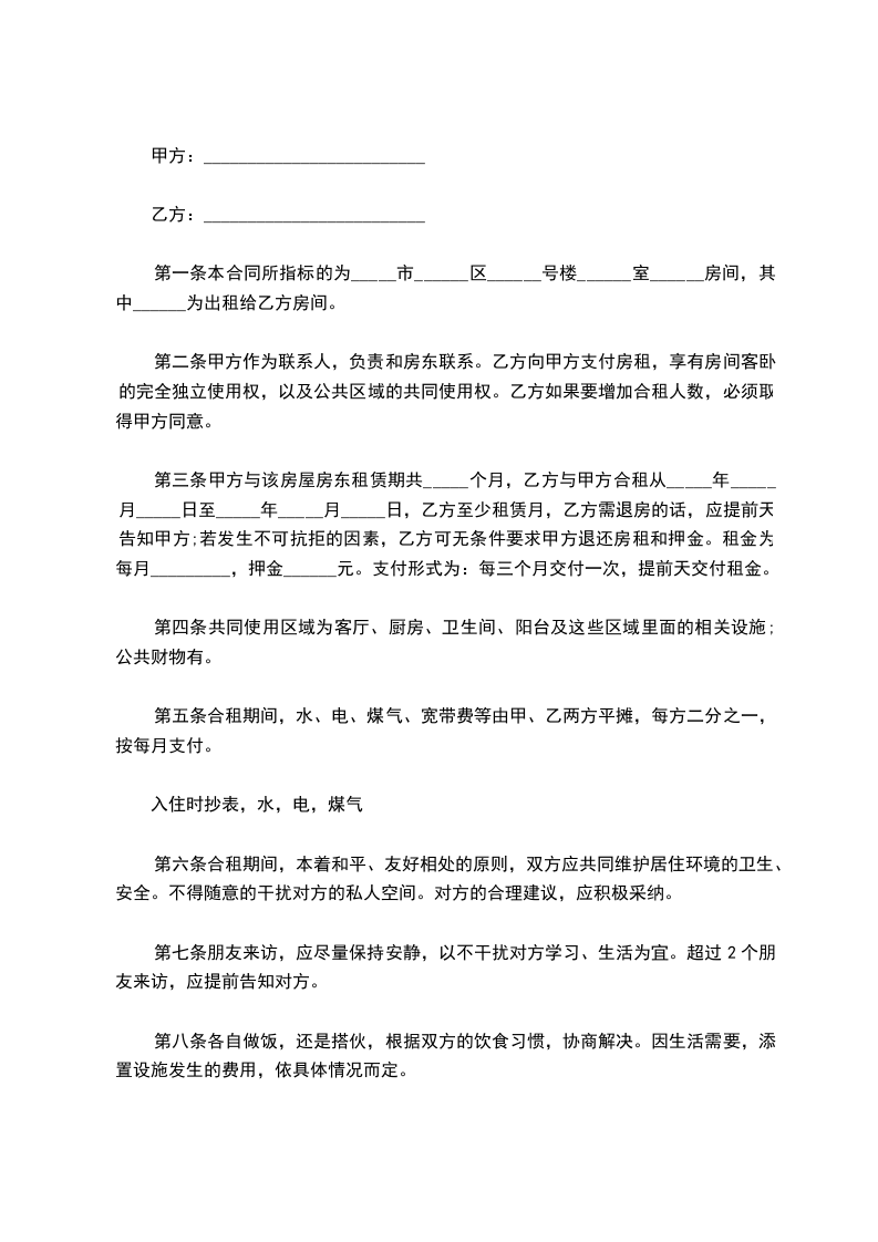 第六条合租期间,本着和平、友好相处的原则,双方应共同维护居住环境的卫生、安全。不得随意的干扰对方的私人空间。对方的合理建议,应积极采纳。