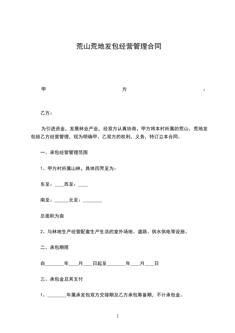 为引进资金,发展林业产业,经双方认真协商,甲方将本村所属的荒山、荒地发包给乙方经营管理,现为明确甲、乙双方的权利,义务,特订立本合同。