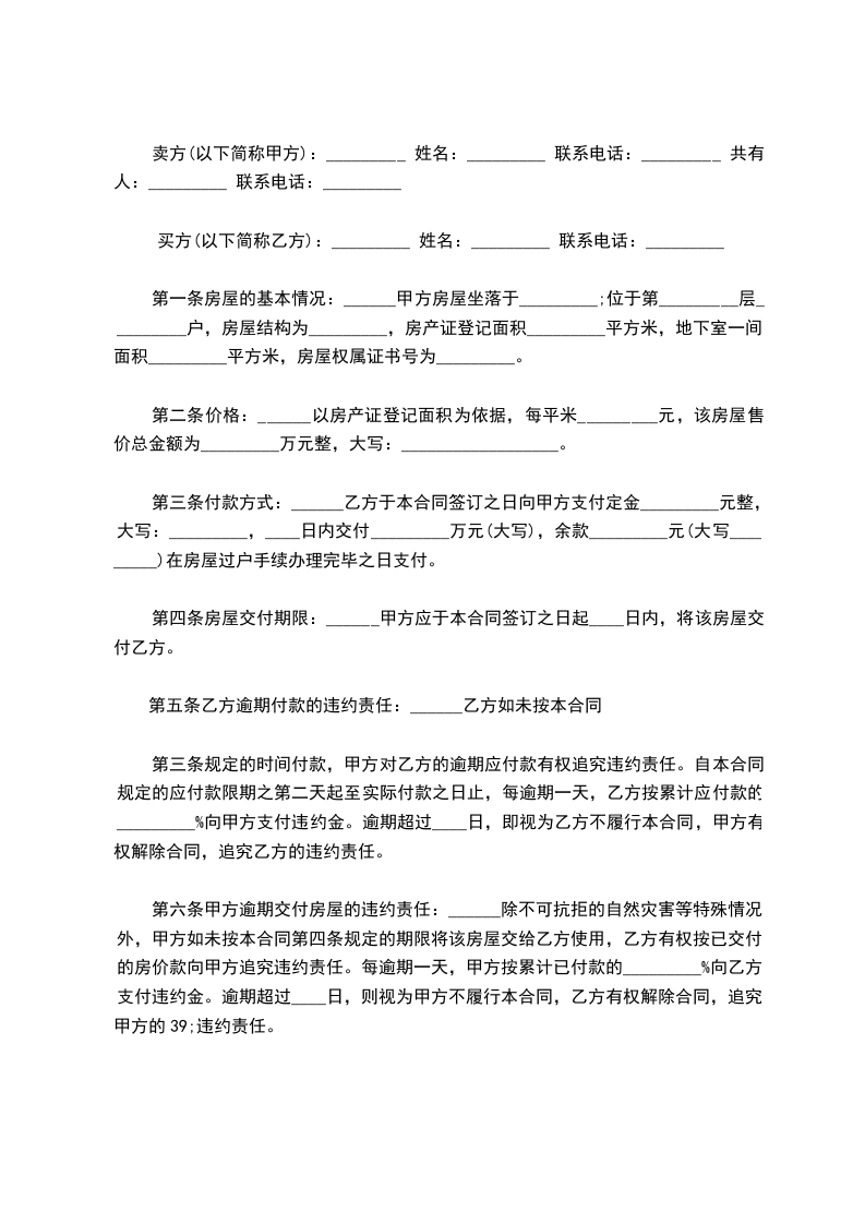 第四条:上述房产的交易总价为:人民币________元整。本合同签定之日,乙方向甲方支付人民币__________元整,作为购房定金。