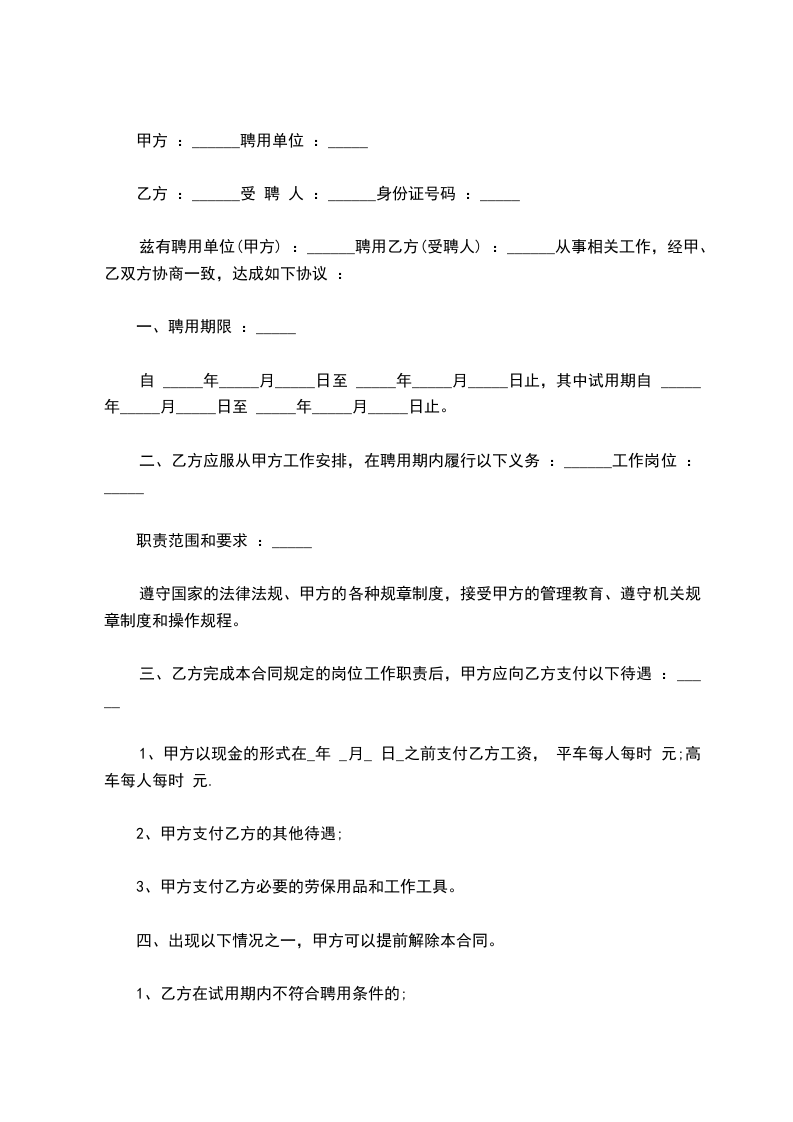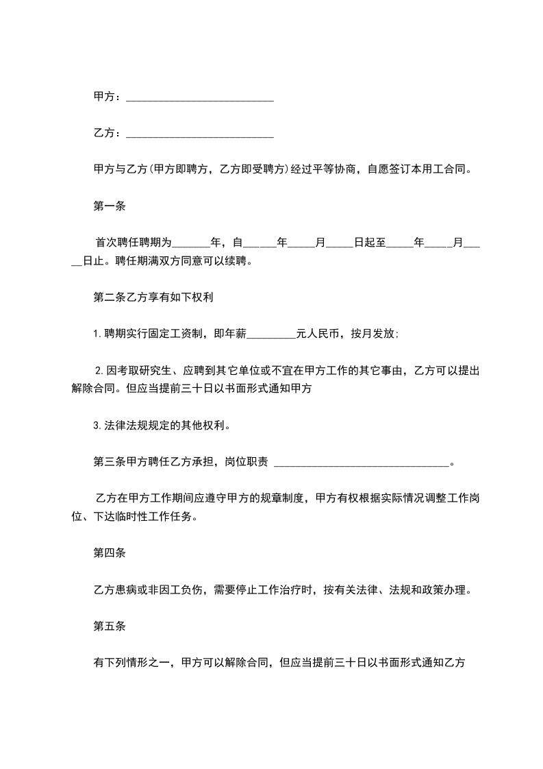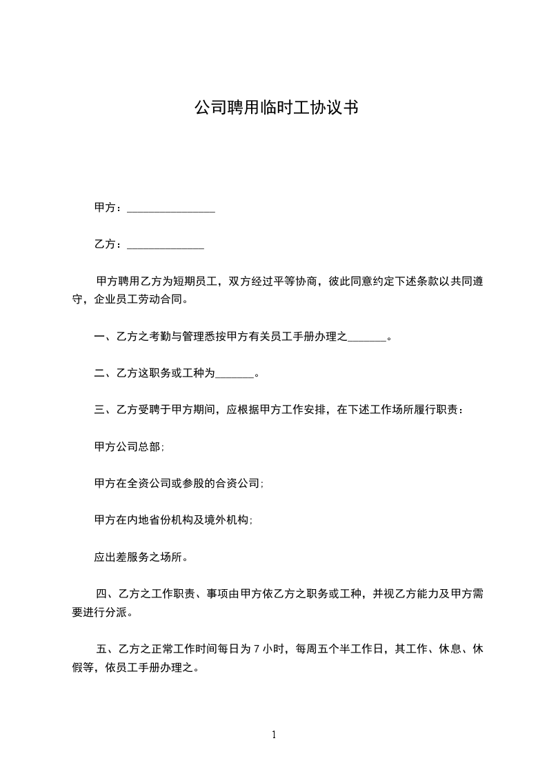 甲方聘用乙方为短期员工,双方经过平等协商,彼此同意约定下述条款以共同遵守,企业员工劳动合同。