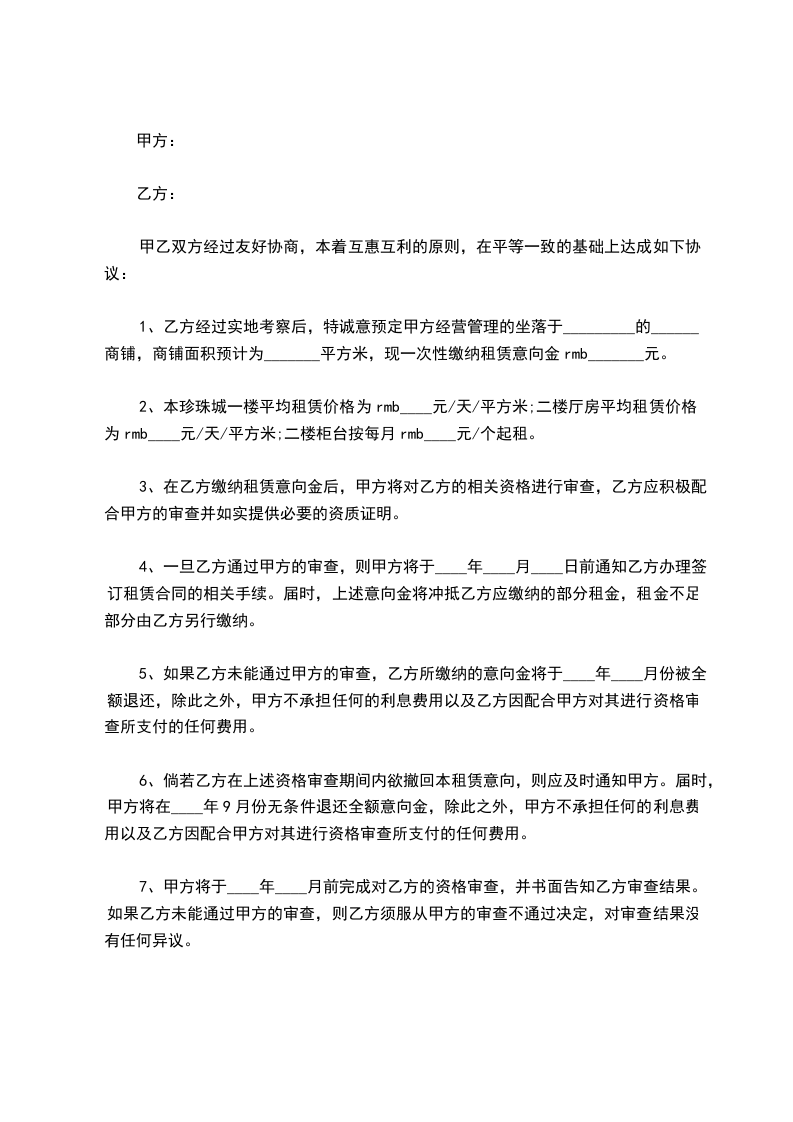 1、每年租金为为人民币_________元整。月租金每平方米不得超过_________元,每米柜台不得超过_________元。