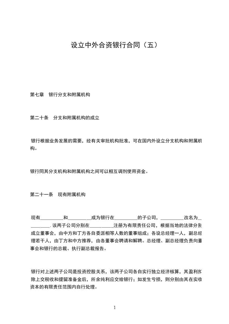 现有__________和__________成为银行在__________的子公司,__________改名为__________.该两子公司分别在__________注册为有限责任公司,根据当地的法律分别成立董事会,由中方和丁方各自委派相等人数的董事组成;各设总经理一人,副总经理若干人,由丁方和中方推荐,由各董事会聘请和解聘。总经理、副总经理负责向董事会和银行的总裁、执行副总裁报告。