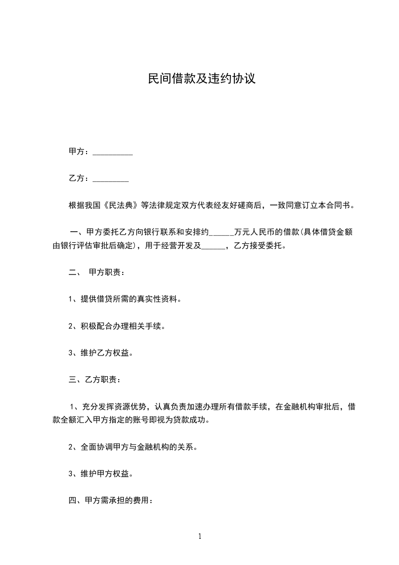 一、甲方委托乙方向银行联系和安排约______万元人民币的借款(具体借贷金额由银行评估审批后确定),用于经营开发及______,乙方接受委托。