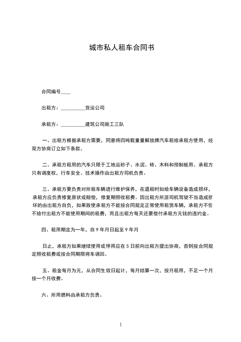 甲方同意专门为乙方提供______辆_________车租给乙方使用。车辆车牌号___________.租赁期自_________年_______月_______日起至_________年_____月_____日止。如本合同到期,双方同意续租,且除时间外的内容无变化时可自动顺延有效。