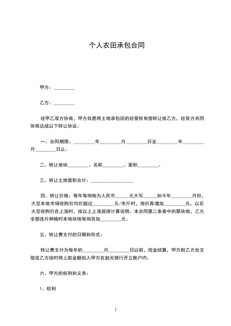 四、转让价格:每年每垧地为人民币______元大写______如今年_________月份,大豆本地市场收购价均价超过_________元/市斤时,地价再增加_________元,以后大豆收购价在上涨时,按以上上涨规律计算说明。本合同第二条表中的那块地,乙方全部连片种植时本地块地每垧另加_________元。