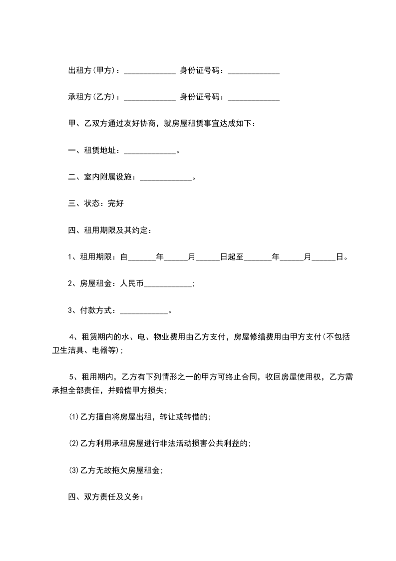 承租方(以下简称乙方):___________身份证号码:______________________