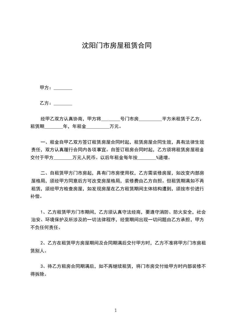 经甲乙双方认真协商,甲方将________号门市房__________平方米租赁于乙方,租赁期________年,年租金__________万元。