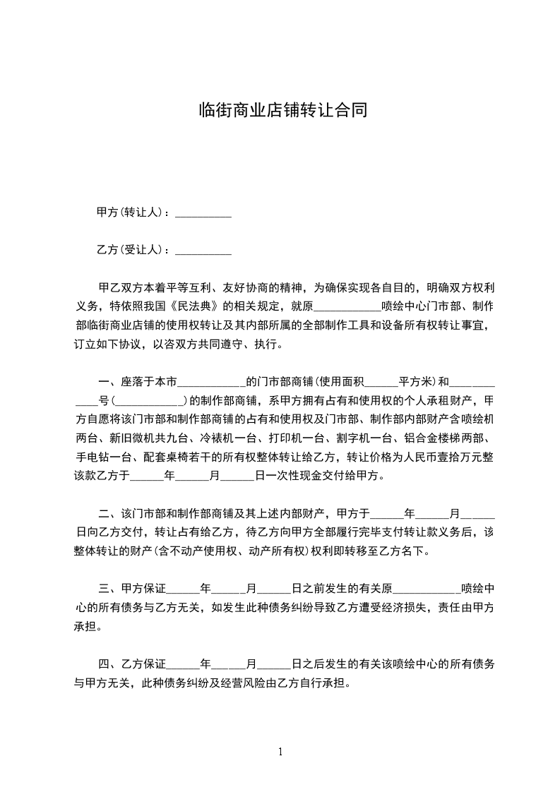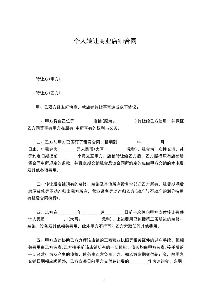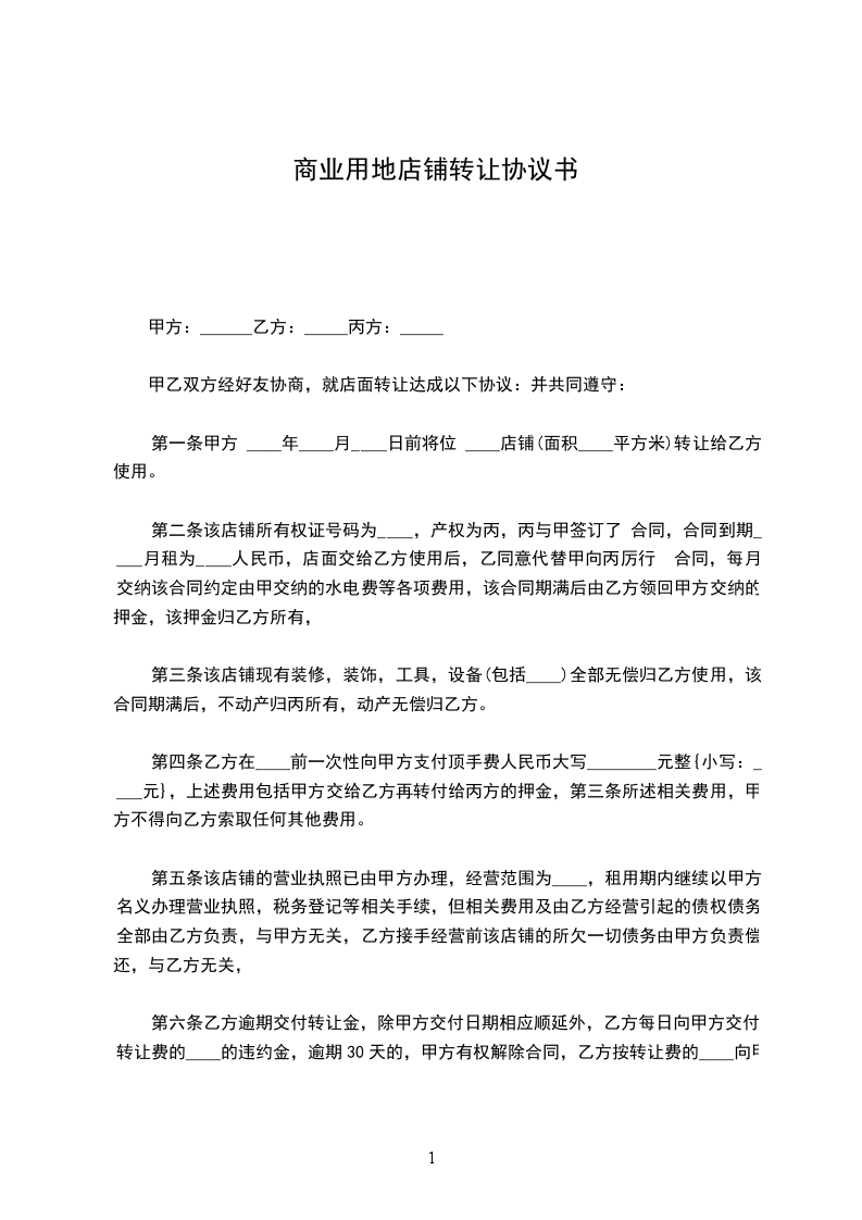 甲、乙双方经友好协商,就店铺转让事宜达成以下协议: