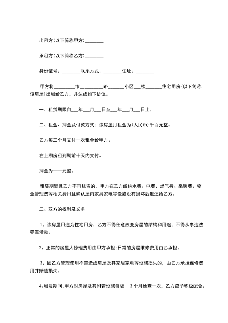 3、本合同期满时,乙方未经甲方同意,继续使用承租房屋,按约定租金的____%,以天数计算向甲方支付违约金后,甲方仍有终止合同的申诉权。