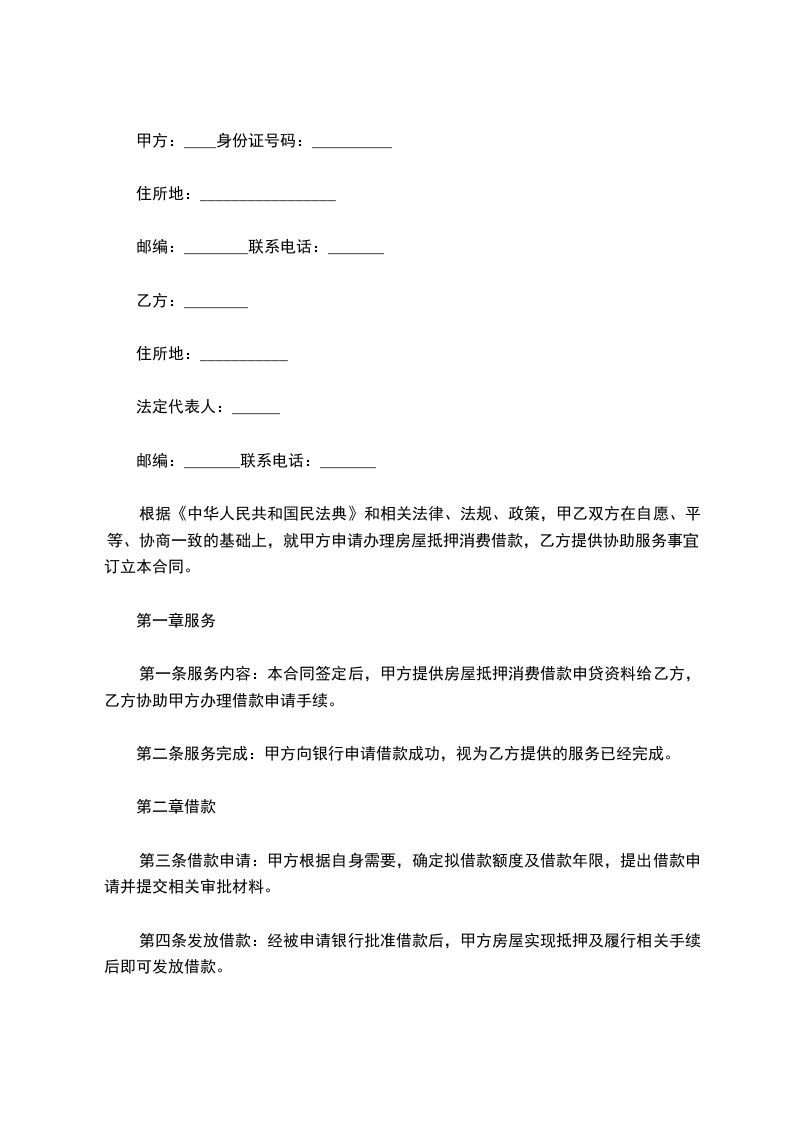 根据《中华人民共和国民法典》和相关法律、法规、政策,甲乙双方在自愿、平等、协商一致的基础上,就甲方申请办理房屋抵押消费借款,乙方提供协助服务事宜,订立本合同。