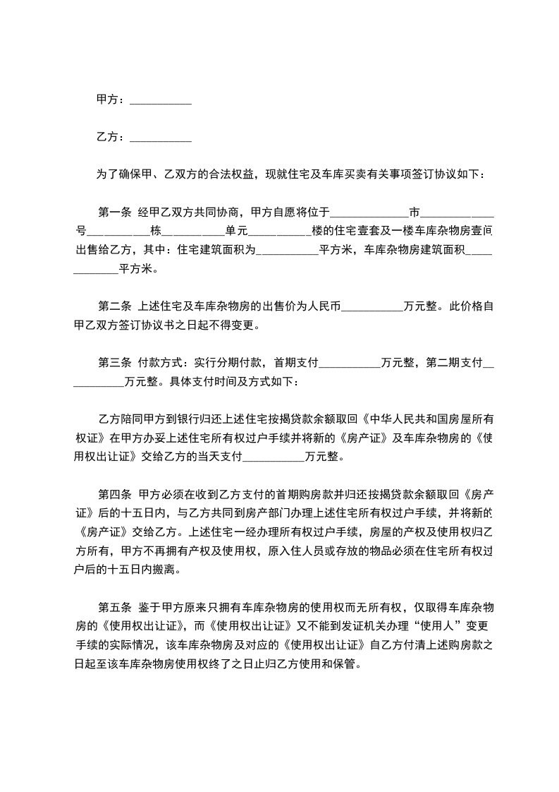 为了确保甲、乙双方的合法权益,现就住宅及车库买卖有关事项签订协议如下: