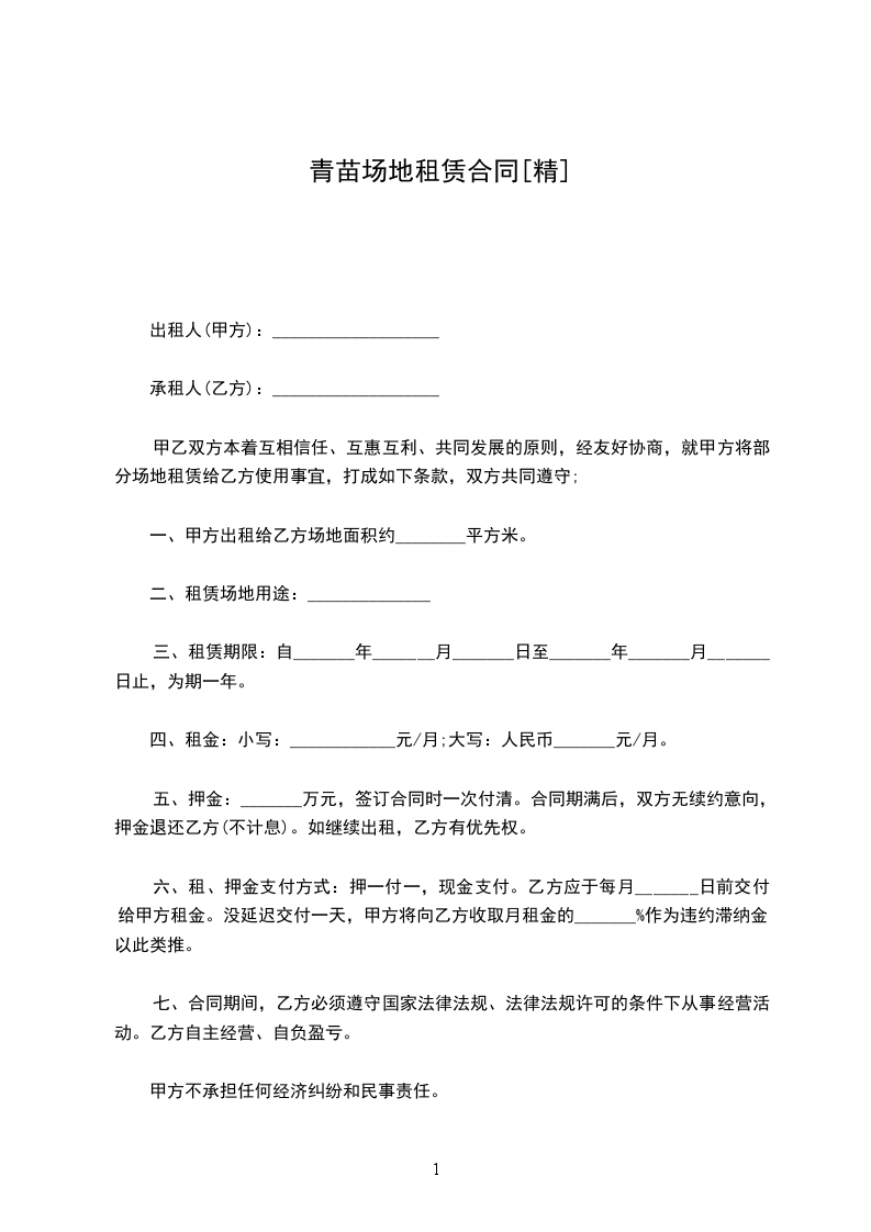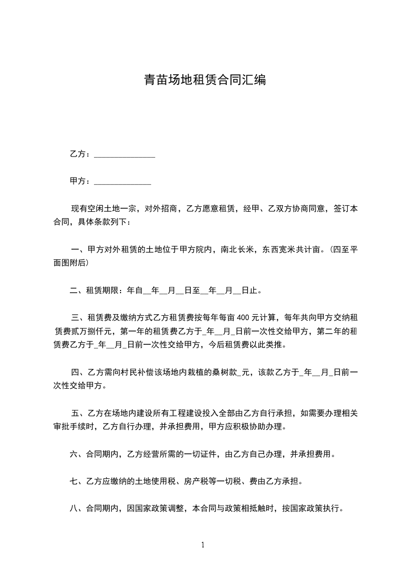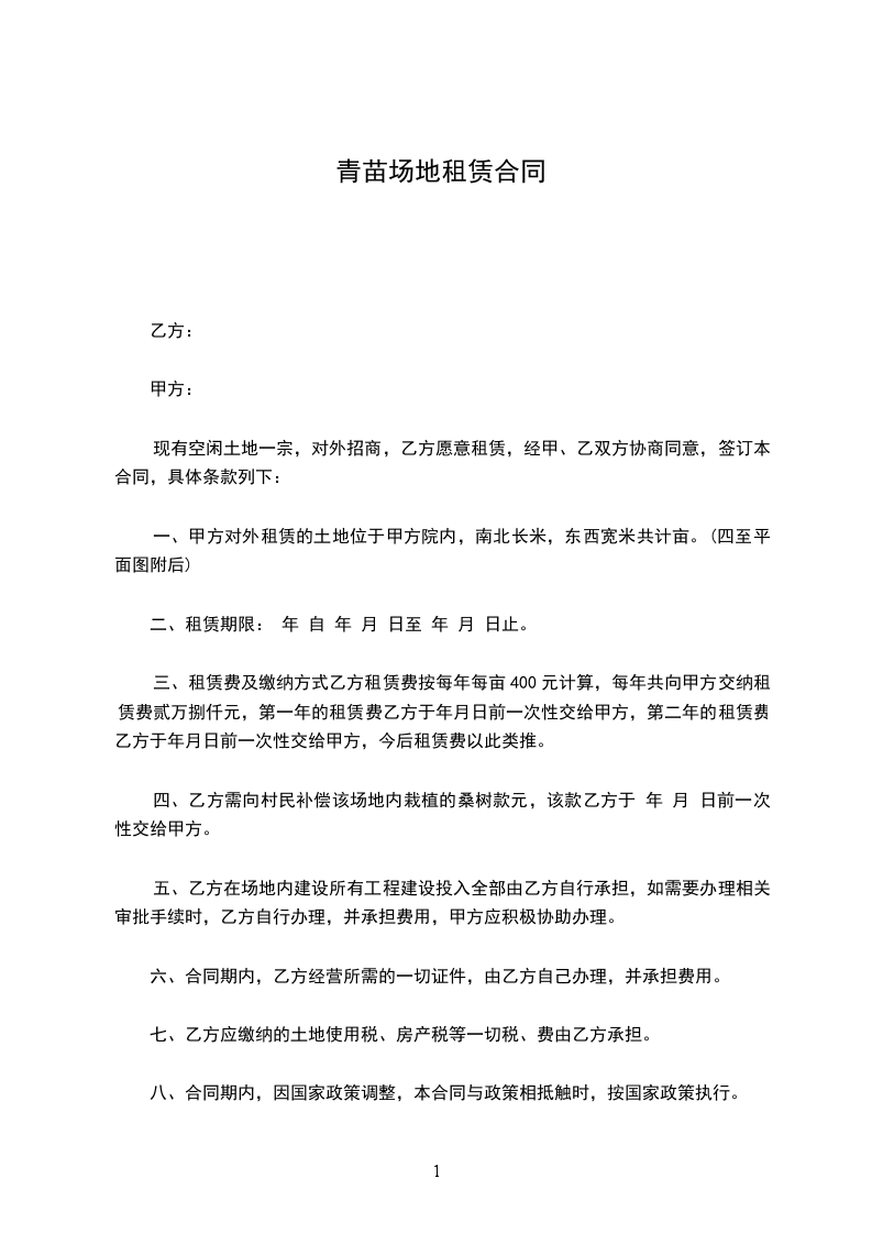十、青苗补偿费每亩每年400元由甲方负责支付,合同签订后青苗补偿费如增加时,从变动之年,租赁费按变动金额进行相应增长。