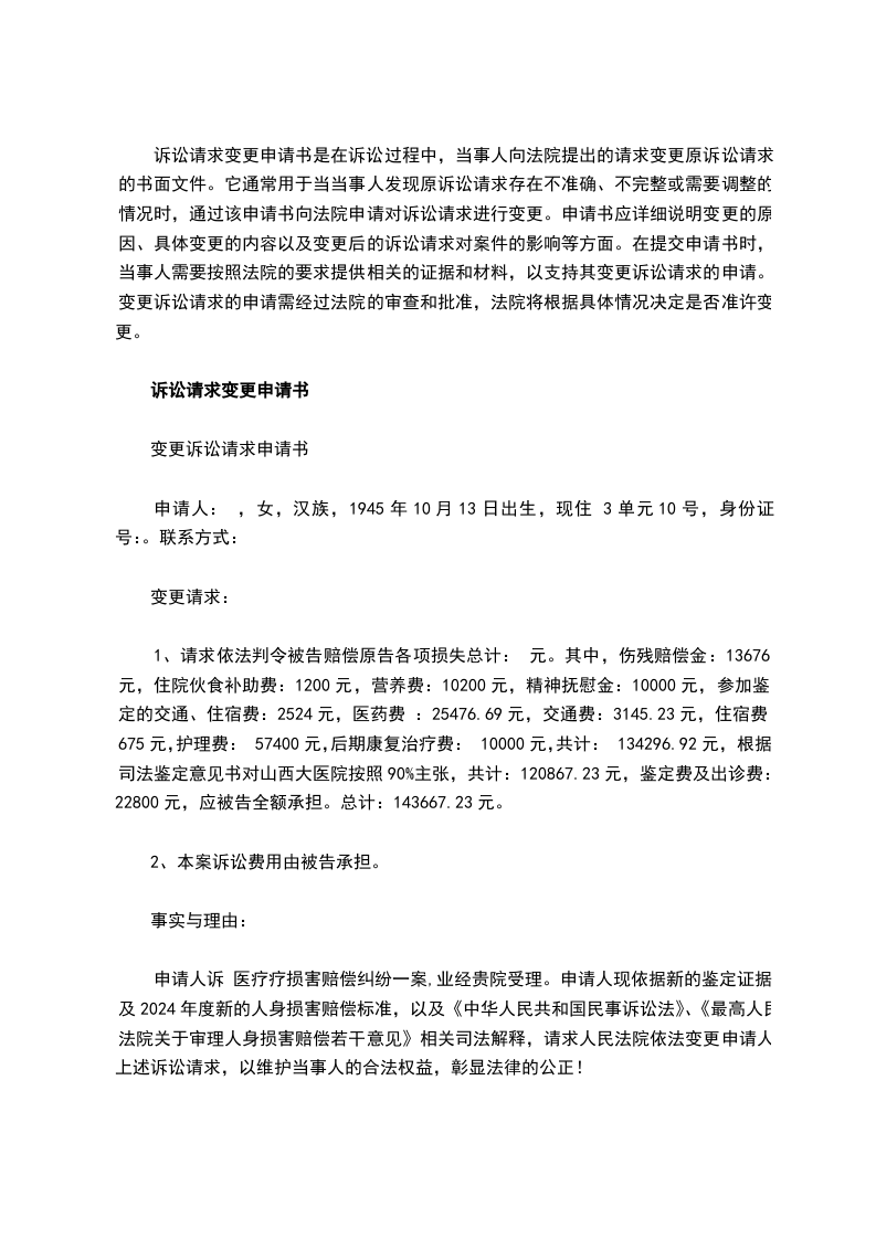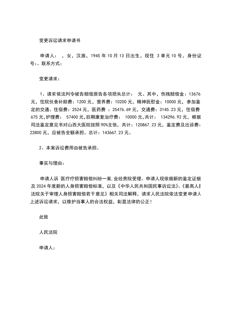 申请人诉 医疗疗损害赔偿纠纷一案,业经贵院受理。申请人现依据新的鉴定证据及2024年度新的人身损害赔偿标准,以及《中华人民共和国民事诉讼法》、《最高人民法院关于审理人身损害赔偿若干意见》相关司法解释,请求人民法院依法变更申请人上述诉讼请求,以维护当事人的合法权益,彰显法律的公正!