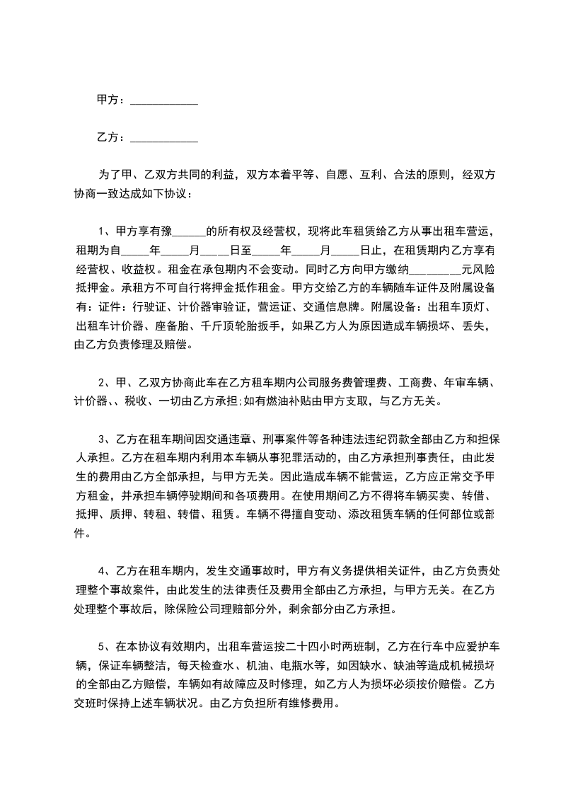 五、乙方在经营过程中不得转租、无故停运,若违反所产生费用由乙方承担,安全保证金不予退还,甲方将收回出租车经营权。