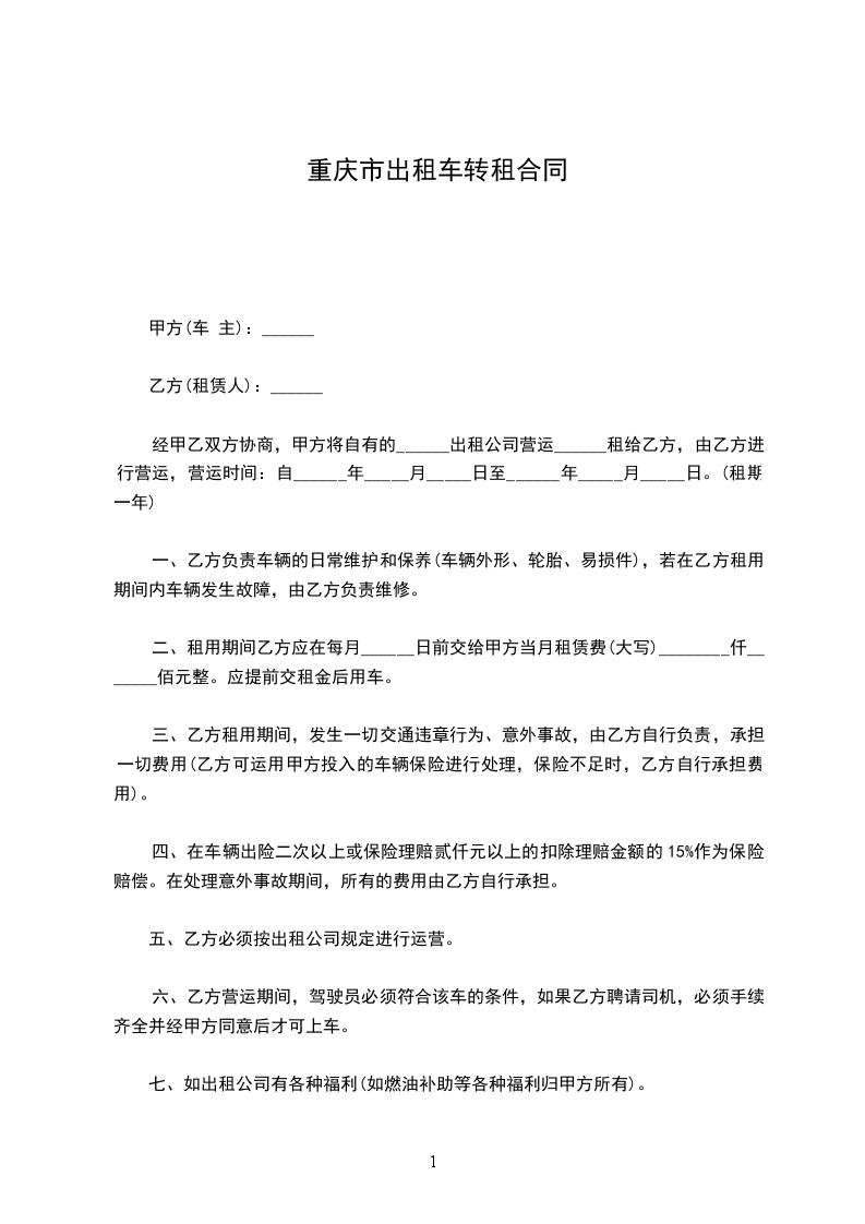 一、经甲、乙双共同协商,甲方愿意将公司出租车转租给乙方正常经营。