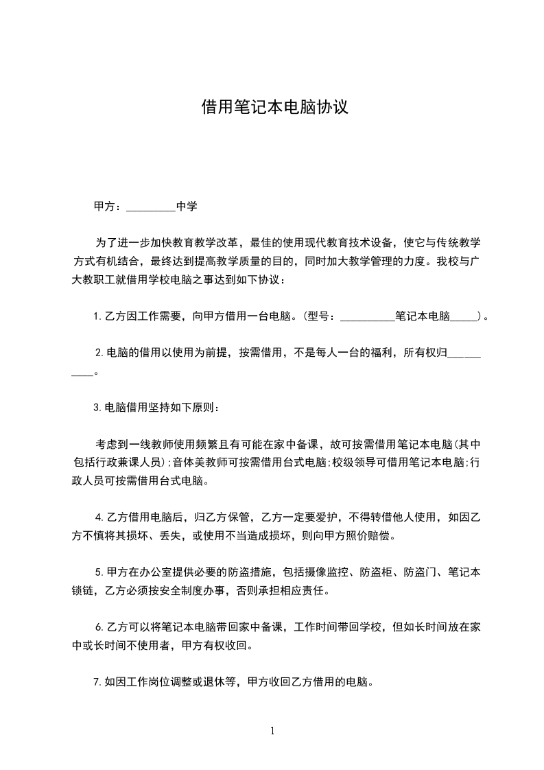 6.乙方可以将笔记本电脑带回家中备课,工作时间带回学校,但如长时间放在家中或长时间不使用者,甲方有权收回。