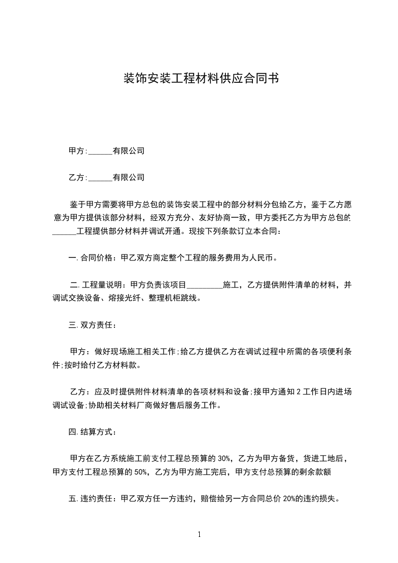 鉴于甲方需要将甲方总包的装饰安装工程中的部分材料分包给乙方,鉴于乙方愿意为甲方提供该部分材料,经双方充分、友好协商一致,甲方委托乙方为甲方总包的______工程提供部分材料并调试开通。现按下列条款订立本合同: