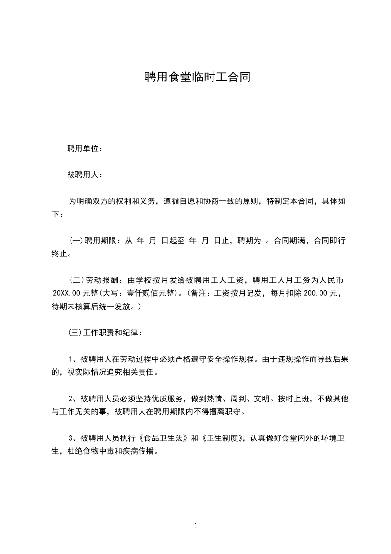 甲方因学生营养餐食堂工作需要,临时招用工作人员。经研究,甲方同意招聘乙方为学校食堂临时工(本次聘用活动具体有各村校负责,教管中心负责监督实施。),经甲乙协商,达成如下协议: