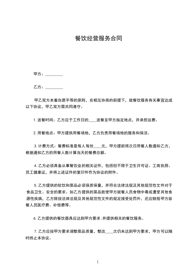 甲乙双方本着自愿平等的原则,在相互协商的前提下,就餐饮服务有关事宜达成以下协议,甲乙双方需共同遵守。