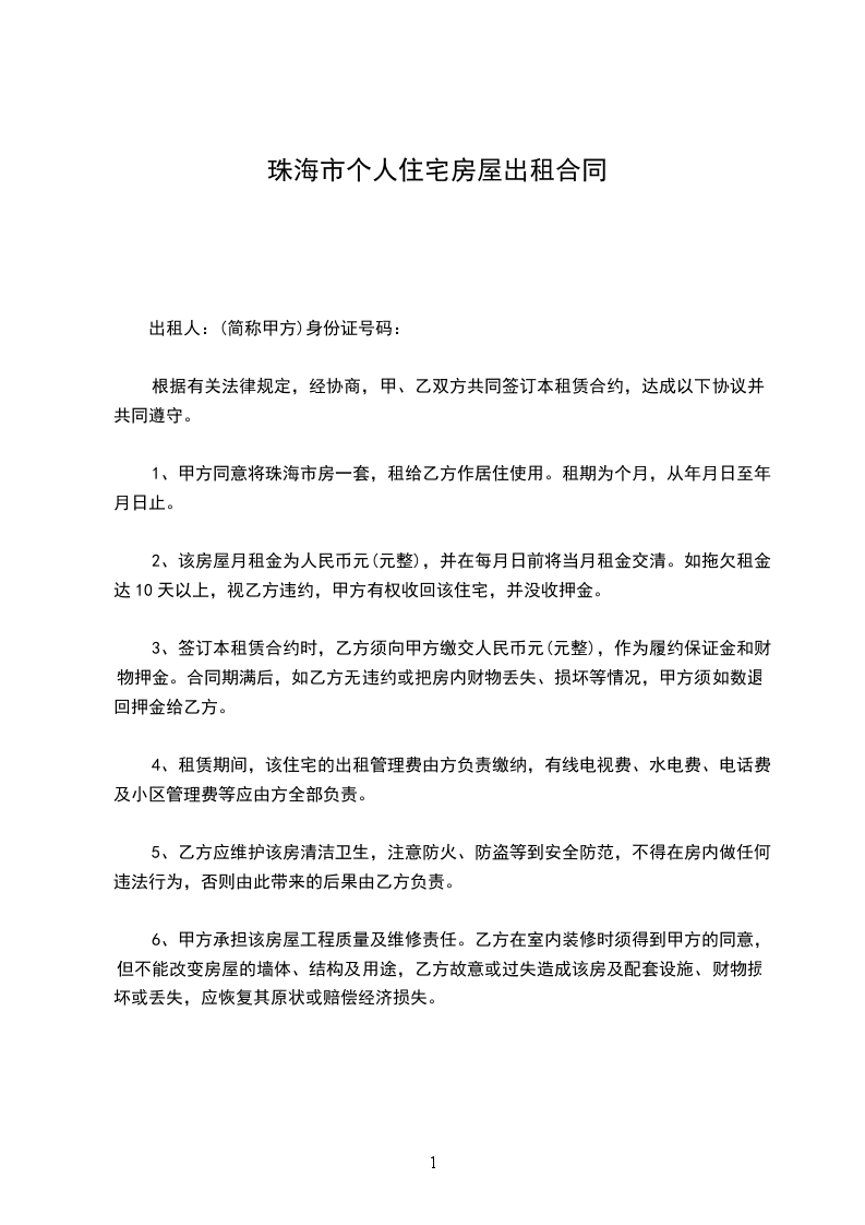 1、甲方同意将珠海市房一套,租给乙方作居住使用。租期为_____个月,从_____年_____月_____日至_____年_____月_____日止。