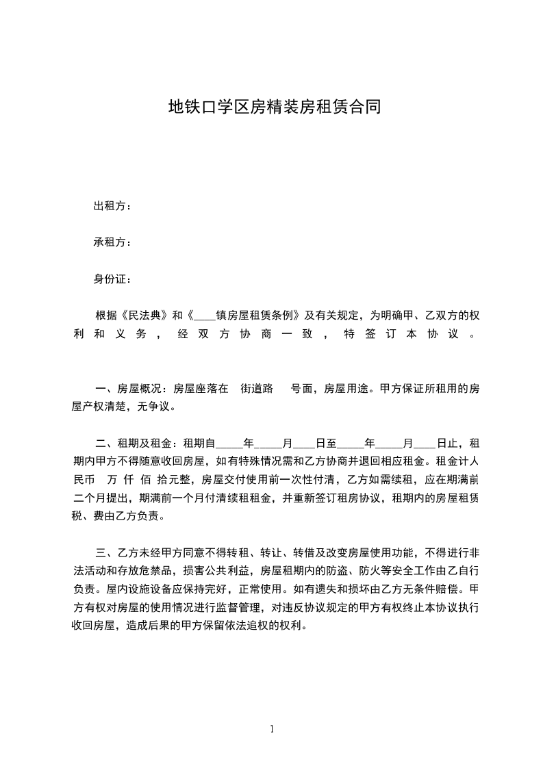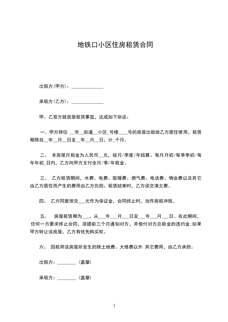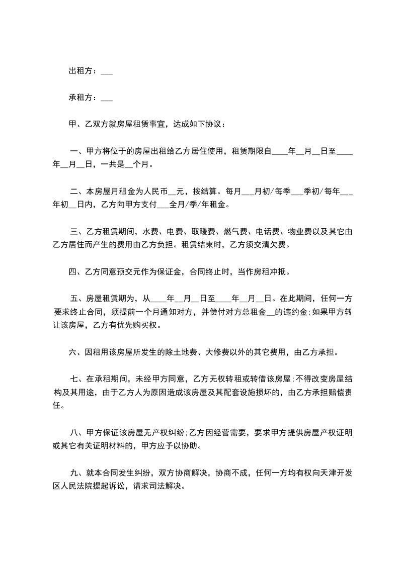 一、甲方将位于的房屋出租给乙方居住使用,租赁期限自____年__月__日至____年__月__日,一共是__个月。