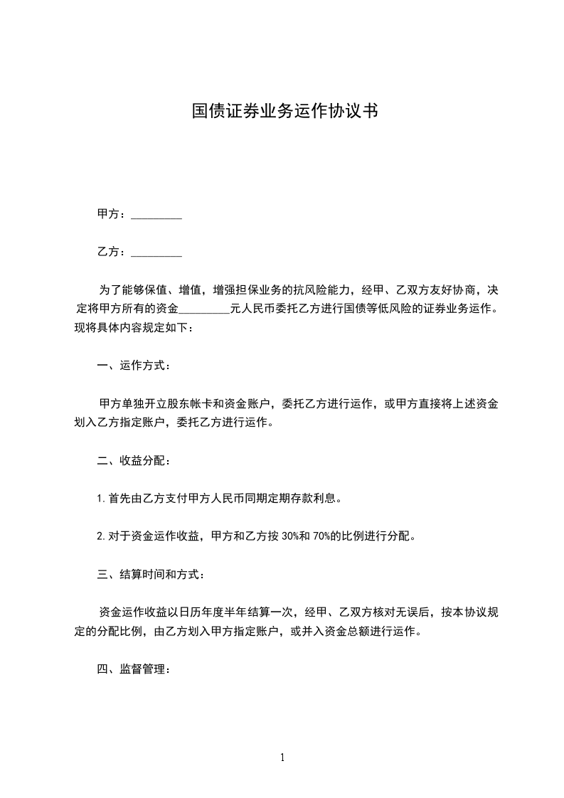 为了能够保值、增值,增强担保业务的抗风险能力,经甲、乙双方友好协商,决定将甲方所有的资金_________元人民币委托乙方进行国债等低风险的证券业务运作。现将具体内容规定如下: