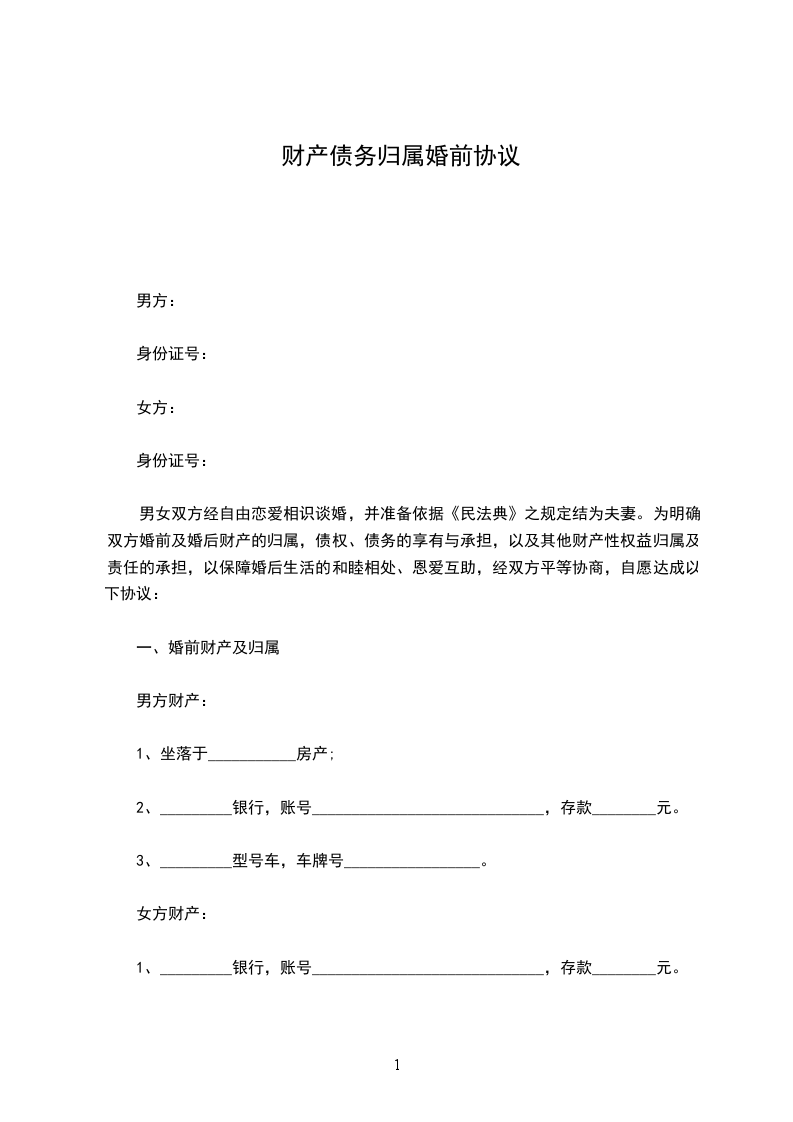 男女双方经自由恋爱相识谈婚,并准备依据《民法典》之规定结为夫妻。为明确双方婚前及婚后财产的归属,债权、债务的享有与承担,以及其他财产性权益归属及责任的承担,以保障婚后生活的和睦相处、恩爱互助,经双方平等协商,自愿达成以下协议: